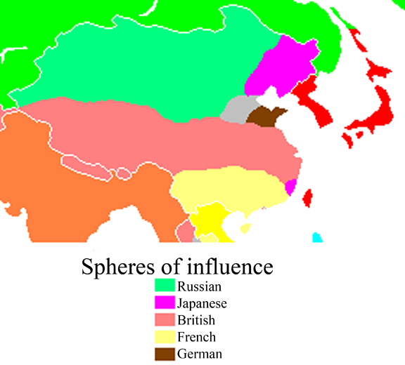 한편, 19세기 중반부터 20세기 초까지 중국은 영국, 프랑스, 독일, 러시아, 일본 등 여러 열강에 의해 각자의 '세력권'으로 분할되는 굴욕의 세기를 겪었다. 열강들은 청나라 정부에 불평등 조약이나 장기 임대 계약 등을 강요하며 광대한 지역에 대한 특별한 권한을 확보했다.[8][43] 이는 중국의 반식민지 상태를 심화시키는 결과를 낳았다. (중국 내 세력권 분할에 대한 자세한 내용은 하위 문서를 참조하라.)