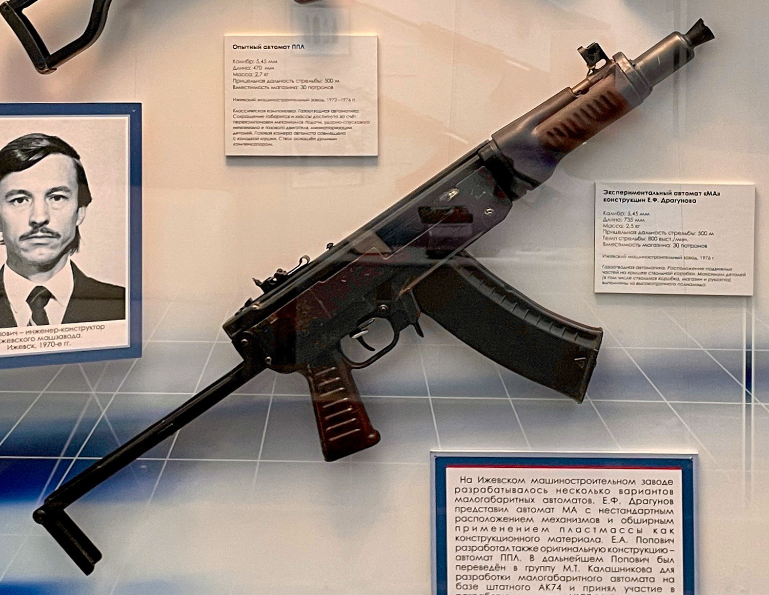 드라구노프는 또한 AKS-74U 자동 소총 채택 경쟁에도 참여했다. 그는 MA(Малокалиберный Автомат|말로칼리베르니 아브토마트ru, 소구경 자동 소총)라는 가스 작동식 설계를 제출했다.[3][4] MA는 성능 면에서 칼라시니코프의 설계와 비슷했지만, 칼라시니코프의 설계는 이미 생산 중이던 AK-74 소총과 일부 부품을 공유한다는 이점 때문에 최종 채택되었다. 폴리아미드로 제작된 비금속 부품을 사용한 MA는 드라구노프의 마지막 주요 설계였으며,[3][4] 사용된 방아쇠 메커니즘은 이전에 그가 설계한 PP-71 기관단총의 것과 상당히 유사했다.[3]