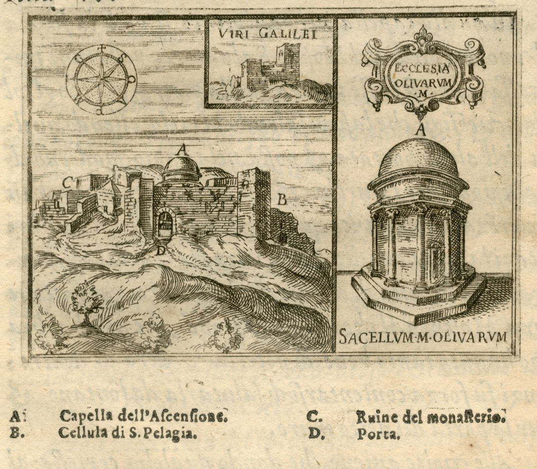 프랑크의 주교이자 순례자인 아르쿨프는 680년경 예루살렘 순례를 묘사하면서 이 교회를 "하늘이 열려있는 둥근 건물로, 남쪽에서 들어가는 세 개의 현관이 있다. 밤에는 예루살렘을 향한 창문을 통해 여덟 개의 램프가 밝게 빛났다. 내부에는 난간 안에 그리스도의 발자국이 먼지에 뚜렷하고 선명하게 새겨진 중앙의 에디큘라가 있었다."라고 묘사했다.[3] 그리스도의 발자국은 돌이 아닌 "'''먼지에 새겨진'''" 것이었다는 점에 주목해야 한다.[3] 이 교회는 7세기 후반에 재건되었다.[3]