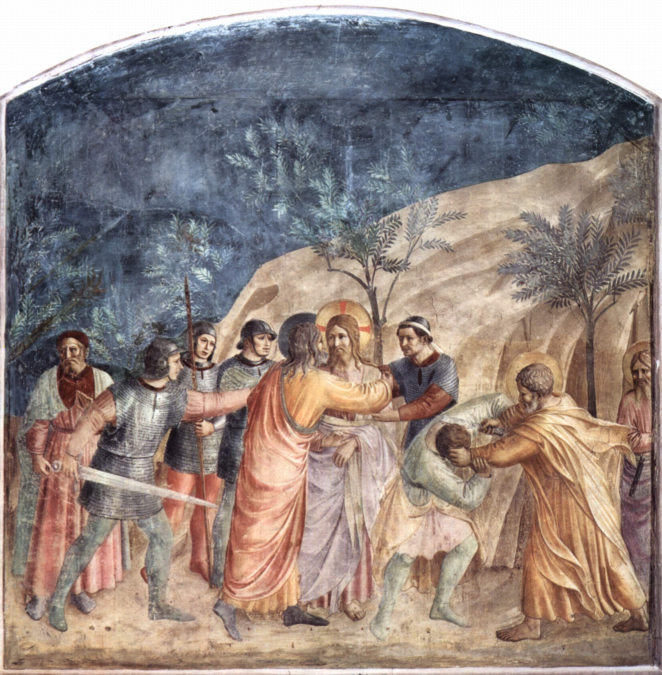 그때 유다가 예수에게 입을 맞추었고, 이것은 유다와 함께 온 사람들에게 예수가 누구인지 미리 약속된 신호였다.[6][8] 사도행전 1장 16절에서 베드로는 예수의 체포와 그를 체포하는 사람들의 길잡이 역할을 한 유다의 역할을 언급한다. 신원이 확인되자, 군인들은 예수를 체포하려 했다. 하지만 예수의 제자 중 한 명이 칼로 그들을 막으려다 체포하는 군인 중 한 명의 귀를 잘랐다.[6][8] 요한 복음서는 이 제자가 시몬 베드로였고, 상처를 입은 군인을 이스라엘의 대제사장 가야바의 종 말고로 특정한다.[6][8] 프라 안젤리코의 작품 ''그리스도의 체포''(1440년경)에는 유다와 베드로가 말고의 귀를 베는 장면이 묘사되어 있다. 루가는 예수가 그 상처를 치유했다고 덧붙인다. 요한, 마태, 누가는 예수가 폭력적인 행동을 비난하며 예수의 체포에 저항하지 말라고 했다고 말한다. 마태는 예수가 "칼을 쓰는 사람은 모두 칼로 망한다"라는 유명한 말을 했다고 전한다.[6][8]