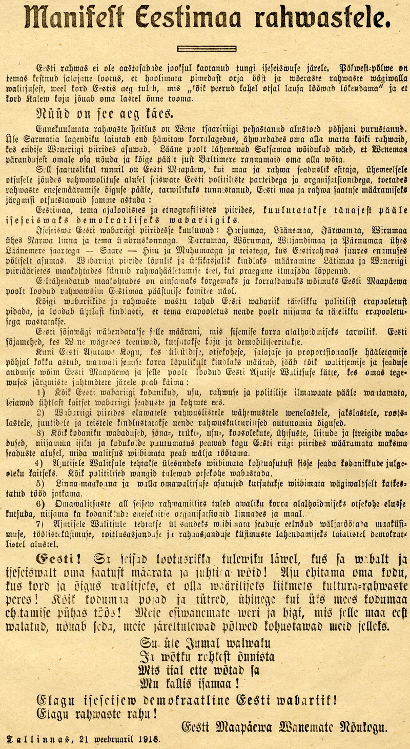 페트로그라드에서 10월 혁명이 성공한 후, 빅토르 킹기세프가 이끄는 에스토니아 군사 혁명 위원회는 임시 정부 행정위원으로부터 권력을 장악했다.[6] 그러나 볼셰비키는 기존 정부 관료들을 대체할 인력이 부족하여 권력을 공고히 하는 데 어려움을 겪었고, 기존 관료들은 볼셰비키에 협력하기를 거부하며 파업을 벌였다.[9] 에스토니아 볼셰비키는 1918년 1월 21~22일과 2월 3~4일에 치러질 예정이었던 에스토니아 제헌 의회 선거를 취소하면서 대중의 지지를 크게 잃었다.[10] 독일군이 남부 리보니아와 에스토니아로 진격해오고 볼셰비키가 소비에트 러시아로 도주하자, 에스토니아 지방 의회(마아파에브)는 1918년 2월 24일 "역사적, 민족적 경계" 내에서 에스토니아 "독립 민주 공화국"을 선언했다. 콘스탄틴 패츠가 새로운 임시 정부의 수반이 되었다.[11][12] 그러나 이 선언은 상징적인 의미에 그쳤고, 바로 다음 날 독일군이 레발(탈린)에 진입하여 에스토니아를 점령했다.