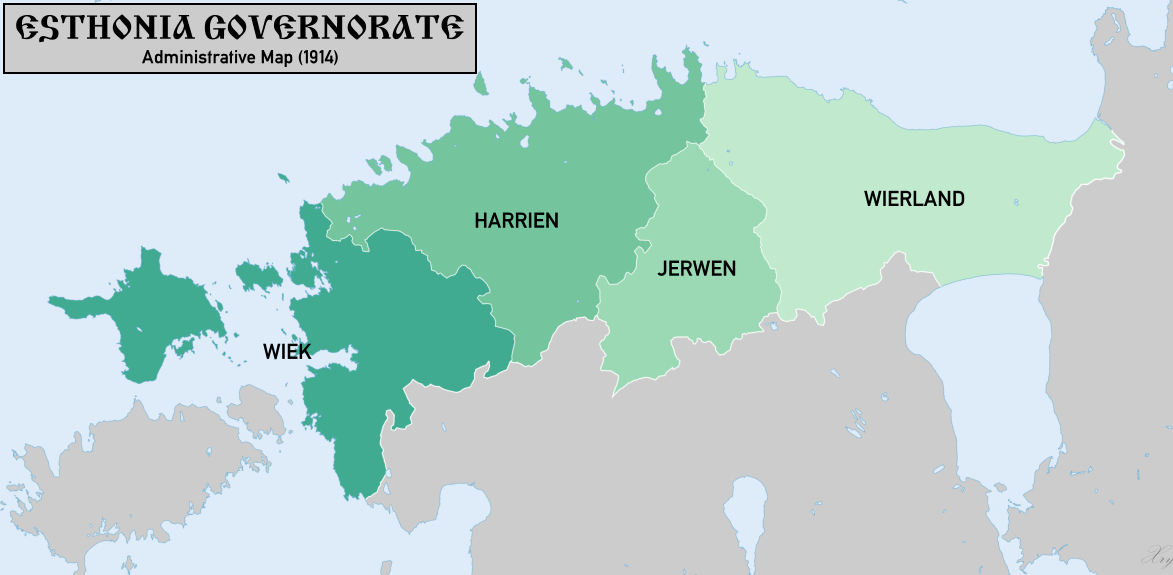 (1897년 인구 조사)[7]독일어 이름 러시아어 이름 1897[8] 비르랜드 Везенбергскій/Вирляндскій 베젠베르크 5,890 7143.2km2 120,230 예르벤 Вейсенштейнскій/Ервенскій 바이센슈타인 2,507 2871.2km2 52,673 비크 Гапсальскій/Викскій 합살 3,212 4697.9km2 82,077 하리엔 Ревельскій/Гарріенскій 레발 64,572 5739.5km2 157,736