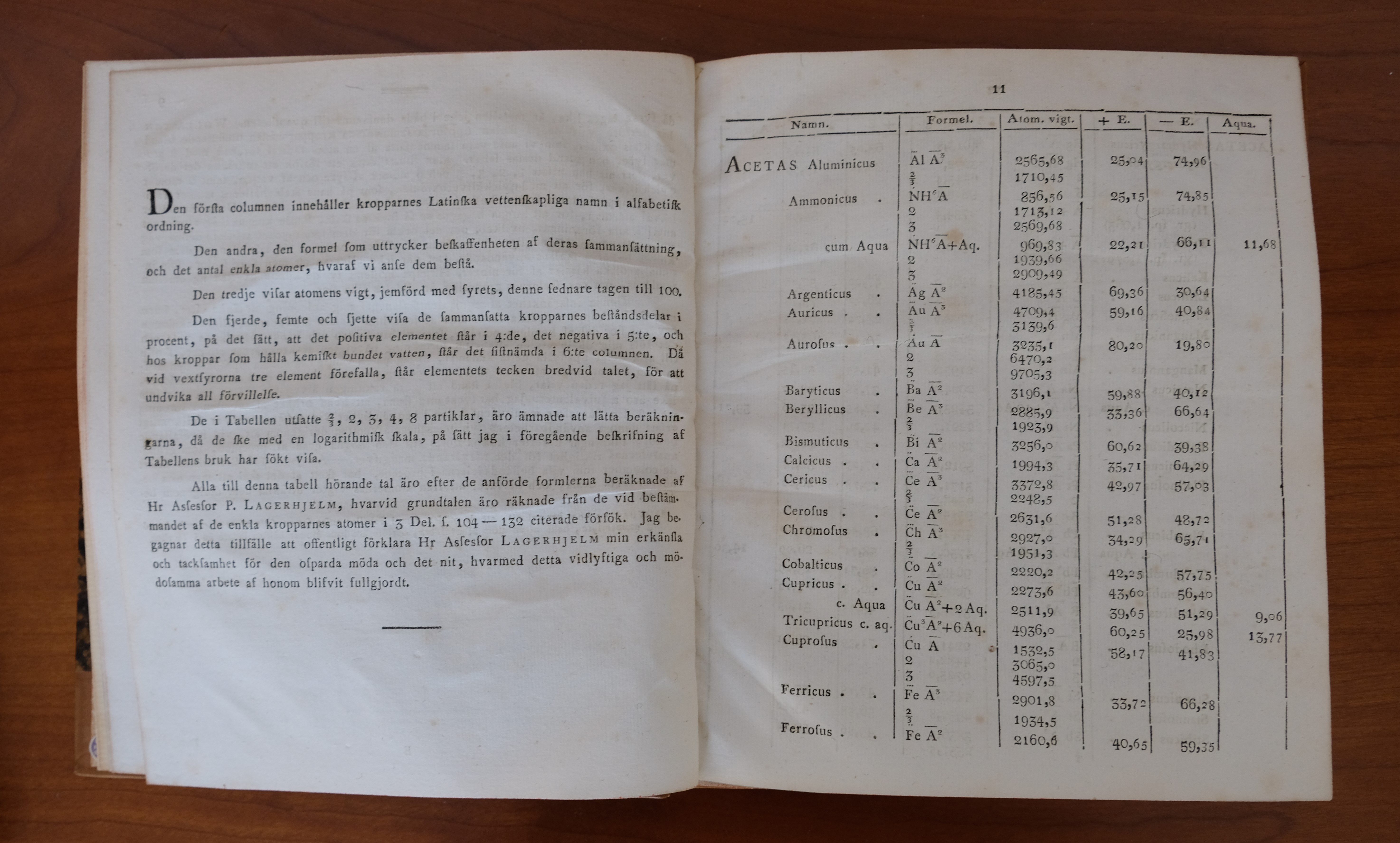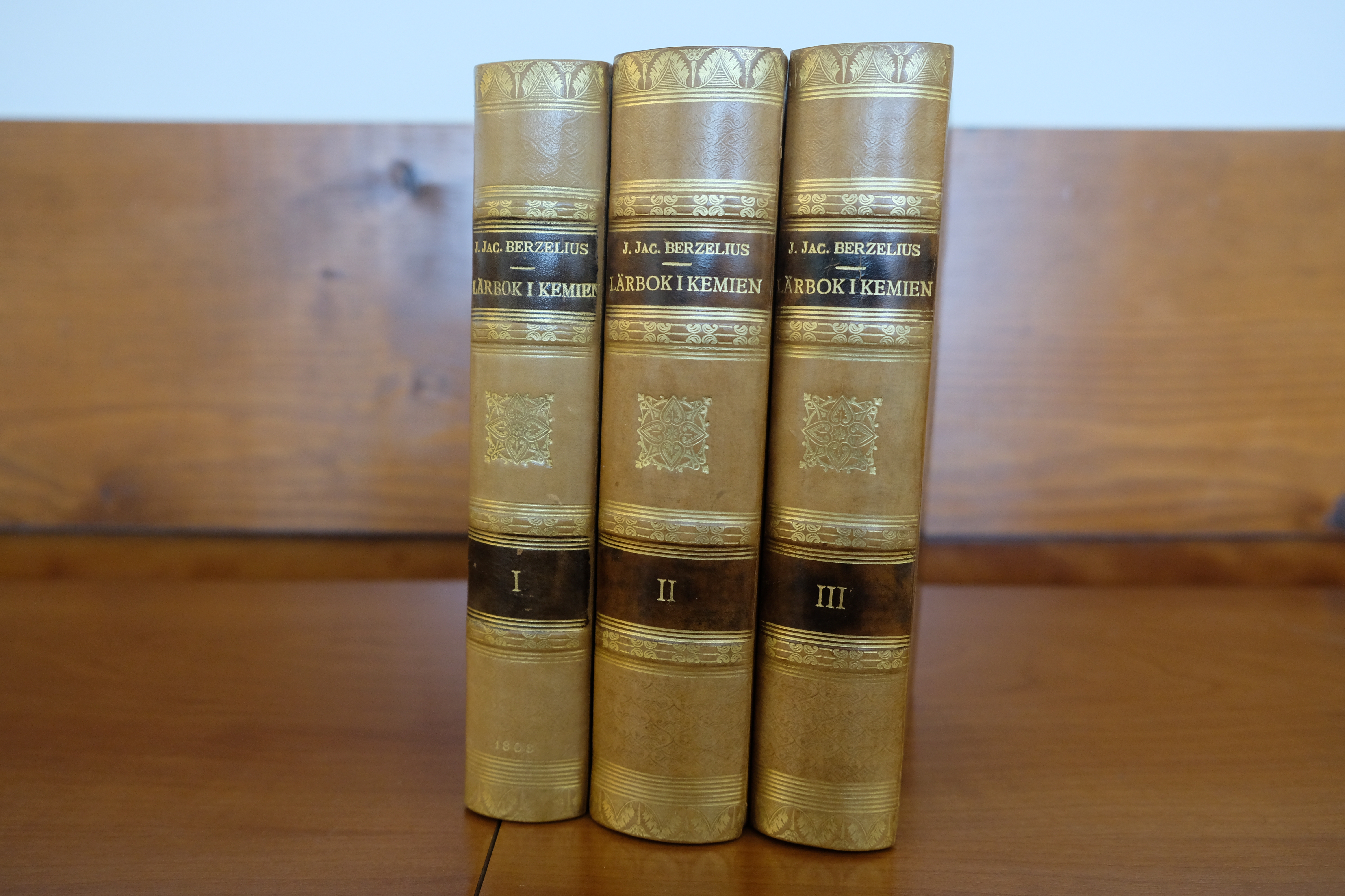 옌스 야코브 베르셀리우스는 카롤린스카 의학 외과 대학 조교 시절부터 스웨덴어 교과서 집필을 계획했다. 대학에서 화학을 가르치기 위해 저술한 『화학 교과서 (Lärbok i Kemien)』 전 6권(1808년~1830년)은 나중에 제자인 프리드리히 뵐러에 의해 『화학 교과서 (Lehrbuch der Chemie)』 전 5권으로 독일어로 번역되었다. 이 책은 당시 최고 수준의 화학 교과서였다. 프랑스어, 영어, 이탈리아어로도 번역되어 화학의 보급에 기여했다.1818년에는 "Tabell, som utvisar vigten af större delen vid den oorganiska Kemiens studium märkvärdiga enkla och sammansatta kroppars atomer, jemte deras sammansättning, räknad i procent"를 출판했다. 베르셀리우스는 원소를 전기적으로 음성인 원소와 양성인 원소로 분류하고, 원자는 반대 전하 사이의 전기적 인력에 의해 결합하여 분자를 형성한다는 전기화학적 이원론을 생각했다.[55] 게이뤼삭의 기체 반응의 법칙을 근거로 화합물 속 원소의 구성비를 추정하고, 1828년까지 당시 알려진 43개의 원소의 원자량을 2000개 이상의 화합물을 정제·분석함으로써 결정했다.[55]