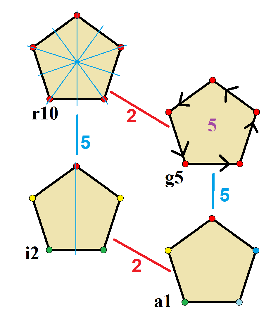 이 4개의 대칭은 오각형에서 4개의 고유한 대칭으로 볼 수 있다. 존 컨웨이는 이를 문자와 그룹 차수로 표시한다.[10] 정규 형태의 전체 대칭은 '''r10'''이며, 대칭이 없는 것은 '''a1'''으로 표시된다. 이각 대칭은 꼭짓점을 통과하는지(대각선인 경우 '''d''') 또는 모서리를 통과하는지(수직인 경우 '''p''')에 따라 나뉘며, 반사선이 모서리와 꼭짓점 모두를 통과하는 경우 '''i'''로 표시된다. 중간 열의 순환 대칭은 중앙 회전 차수에 따라 '''g'''로 표시된다.