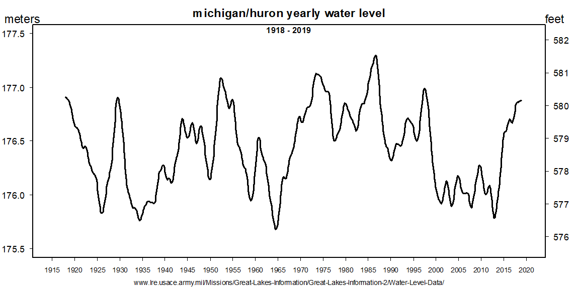 태양과 달의 중력에 의해 발생하는 수위 변화인 진짜 조석은 반일주기(하루 두 번) 패턴으로 발생하지만, 이러한 변화는 매우 작고 일반적으로 다른 힘에 가려진다.[38] 호수 수위는 주로 지역 기상 및 기후 변화의 영향을 받는다. 슈피리어 호와 온타리오 호의 유출량은 조절되지만, 미시간-휴런 호와 이리 호의 유출량은 전혀 조절되지 않는다. 온타리오 호는 유출량이 모세-손더스 발전 댐에 의해 제어되는 가장 엄격하게 조절되는 호수이며, 이것이 일관된 역사적 수위를 설명한다.[39]