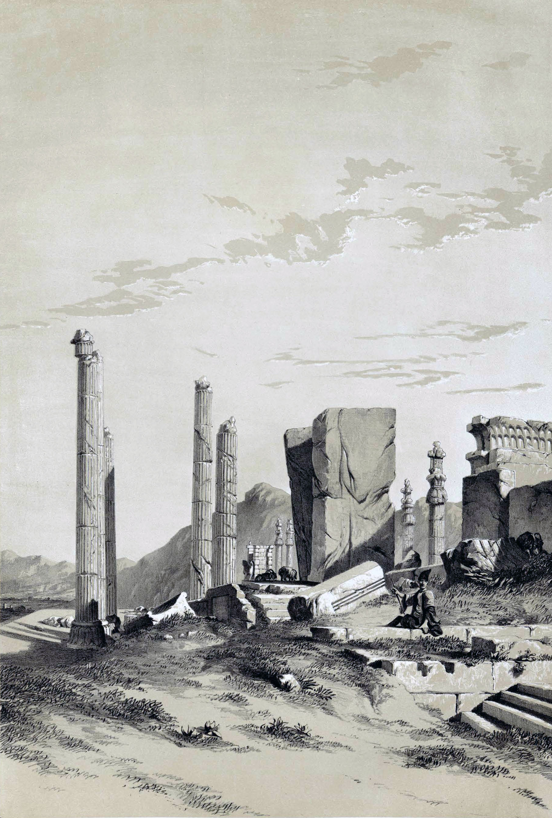 오도릭이 통과한 고대 페르시아 도시 페르세폴리스. 외젠 플랑댕의 1840년 그림.