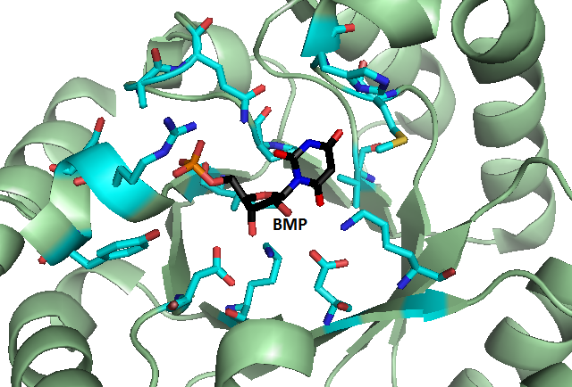 OMP 탈카복실화효소가 반응을 촉매하는 정확한 메커니즘은 엄격한 과학적 연구의 대상이었다. 피리미딘 고리의 C6에 연결된 카복실기의 소실을 유도하는 힘은 효소 활성 부위 내의 아스파트산 잔기 카복실기의 근접성에서 비롯되며, 이는 무촉매 반응의 전이 상태에 비해 기저 상태를 불안정하게 만든다. C6 탄소의 양성자화가 일어나 최종 생성물이 형성되기 전 전이 상태가 어떤 형태를 취하는지에 대한 여러 가설이 존재했다. 많은 연구에서 OMP 탈카복실화효소의 강력한 억제제인 6-하이드록시 우리딘 일인산(BMP, 바르비투르산 유도체)의 활성 부위 내 결합을 조사하여 전이 상태의 안정화에 직접 관여하는 필수 아미노산 잔기를 식별했다. (BMP에 결합된 효소 그림 참조) OMP의 효소적 탈카복실화에 대한 여러 메커니즘이 제안되었으며, 중간체로서 쌍성 이온 종의 형성을 위한 O2에서의 양성자화,[6] O4의 음이온 안정화,[7] 또는 C5에서의 친핵성 공격 등이 있다.[8]