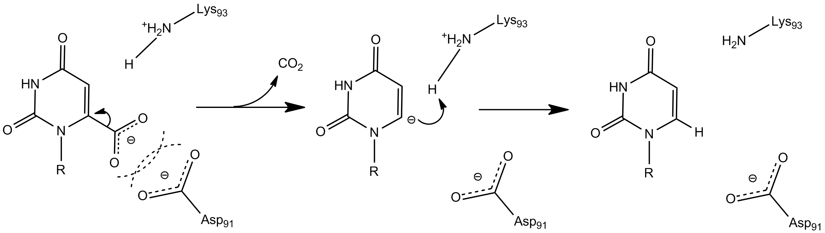 현재의 합의는 이산화탄소 손실 후 C6에서 안정화된 카바니온을 통해 메커니즘이 진행된다는 것이다. 이 메커니즘은 경쟁적 억제 및 활성 부위 돌연변이 유발과 함께 동위원소 효과를 조사하는 연구에서 제안되었다.[9][10][11][12] (카바니온 중간체에 대한 자세한 내용은 하위 섹션에서 다룬다.)