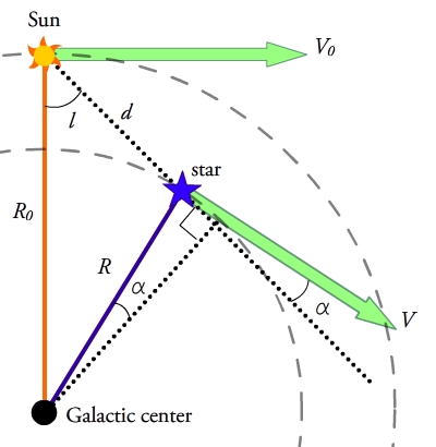 그림 1의 기하학적 관계를 보면, 은하 중심, 태양, 별이 이루는 삼각형에서 다음 관계식을 얻을 수 있다.