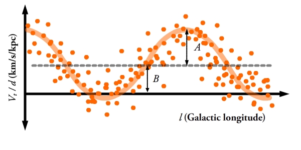 은하 원반 평면에 있는 별 하나를 가정한다. 이 별은 은경 을 가지며, 태양으로부터 만큼 떨어져 있다. 별과 태양 모두 은하 중심을 중심으로 원 궤도를 그리며 공전한다고 가정한다. 각각의 궤도 반경은 과 이고, 공전 속도는 각각 와 이다. 태양의 위치에서 관측했을 때, 별이 우리 시선 방향으로 움직이는 속도(시선 속도)와 천구면 위에서 움직이는 속도(접선 속도)는 다음과 같이 표현할 수 있다.