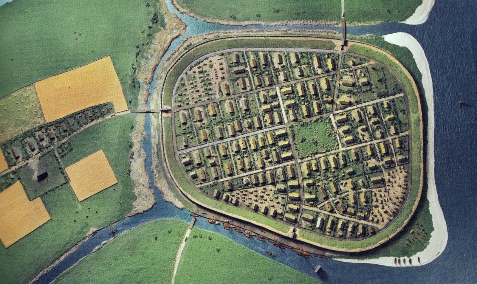 고고학적 증거는 아르후스가 8세기 후반부터 도시였음을 나타낸다.[18][19] 2003년 고고학 발굴 이후 발견된 것들에는 반쯤 묻힌 롱하우스, 화덕, 유리 구슬, 그리고 700년대 후반으로 거슬러 올라가는 도로가 포함된다.[20] 1960년대 이후 도심에서 이루어진 여러 발굴 작업을 통해 우물, 거리, 주택, 작업장이 발견되었고, 건물 내부와 인접한 고고학적 지층에서는 약 900년경의 빗, 보석, 기본적인 다용도 도구와 같은 일상 용품이 발굴되었다.[21] 초기 도시는 900년대 초, 아마도 934년 고름 옛왕(Gorm the Old)의 명령에 따라 방어용 흙으로 된 성벽으로 요새화되었다. 이후 그의 아들 하랄드 블루투스(Harald Bluetooth)에 의해 요새가 개량되고 확장되어 다른 곳의 바이킹 원형 요새에서 발견되는 방어 시설과 마찬가지로 정착지를 둘러쌌다.[18] 도시의 지리적 위치와 함께 이는 아로스가 바이킹 시대에 중요한 군사 중심지가 되었음을 시사한다. 아르후스 시 중심부에서 남쪽으로 수 킬로미터 떨어진 비비에도 같은 시대의 옛 왕궁의 흔적이 강하게 나타난다.[22][23]