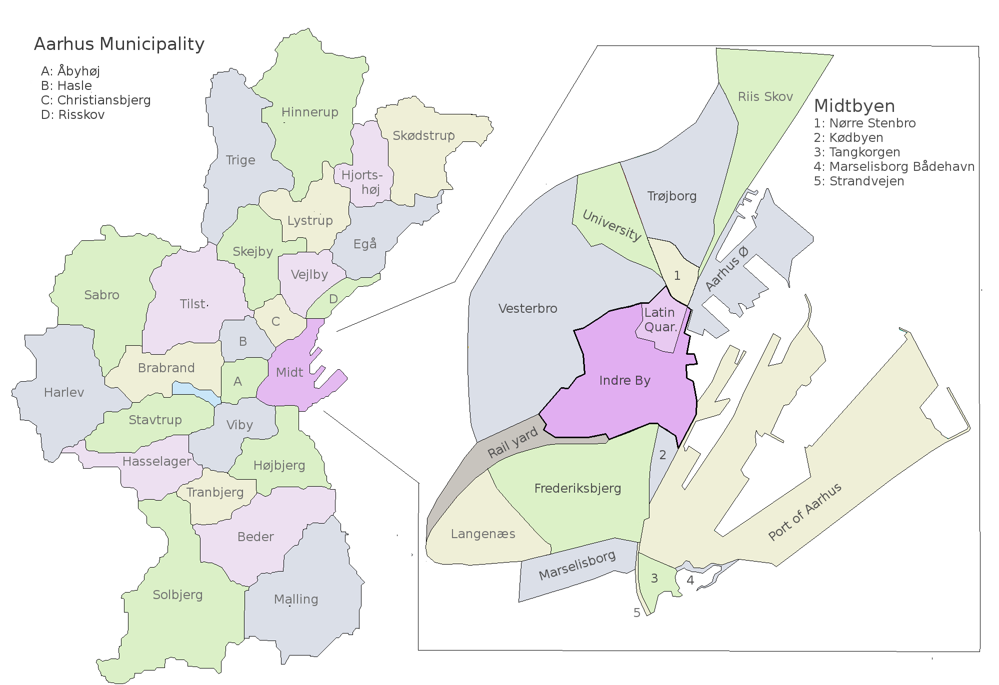 오르후스는 여러 개의 동네를 포함하는 다양한 수준의 구역으로 나뉜다. ''Indre By''(문자 그대로 영어로 "Inner City")로 알려진 역사적인 중심지에는 ''Centralværkstedet'', 라틴 쿼터 및 중앙역과 오르후스 콘서트 홀 주변 지역이 포함된다.[18] 내부 순환도로 링 1에는 대략 우편 구역 오르후스 C에 해당하는 더 큰 구역 미트비엔 (문자 그대로 시 중심)이 있으며, Indre By, 베스터브로, 프레데릭스비에르, 오르후스 외, 마르셀리스보르 및 뇌레 스텐브로로 구성된다.[19]