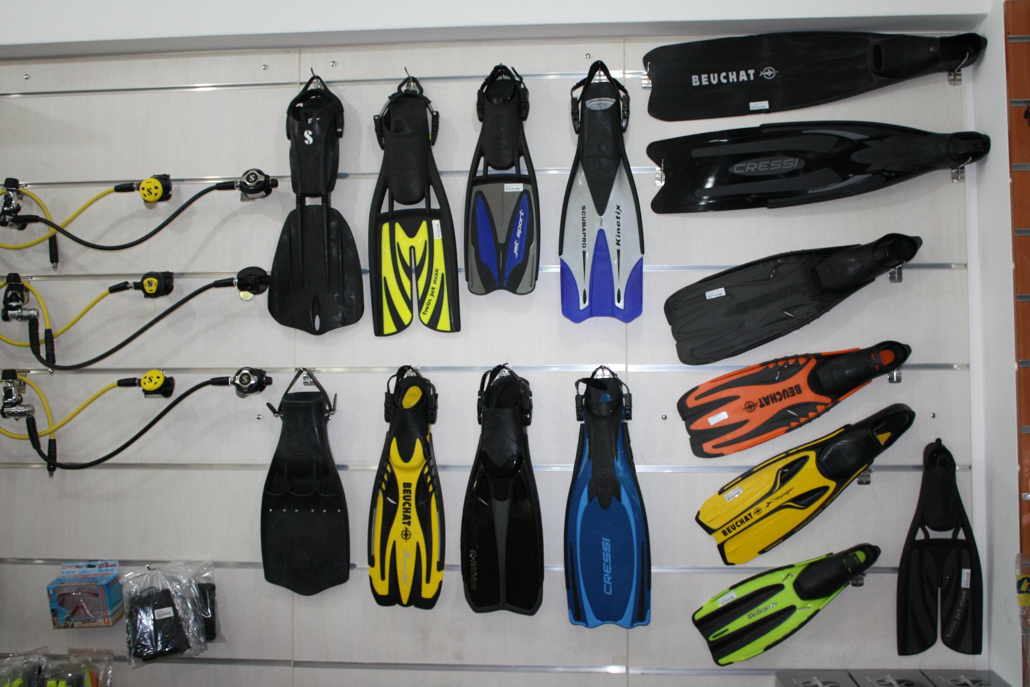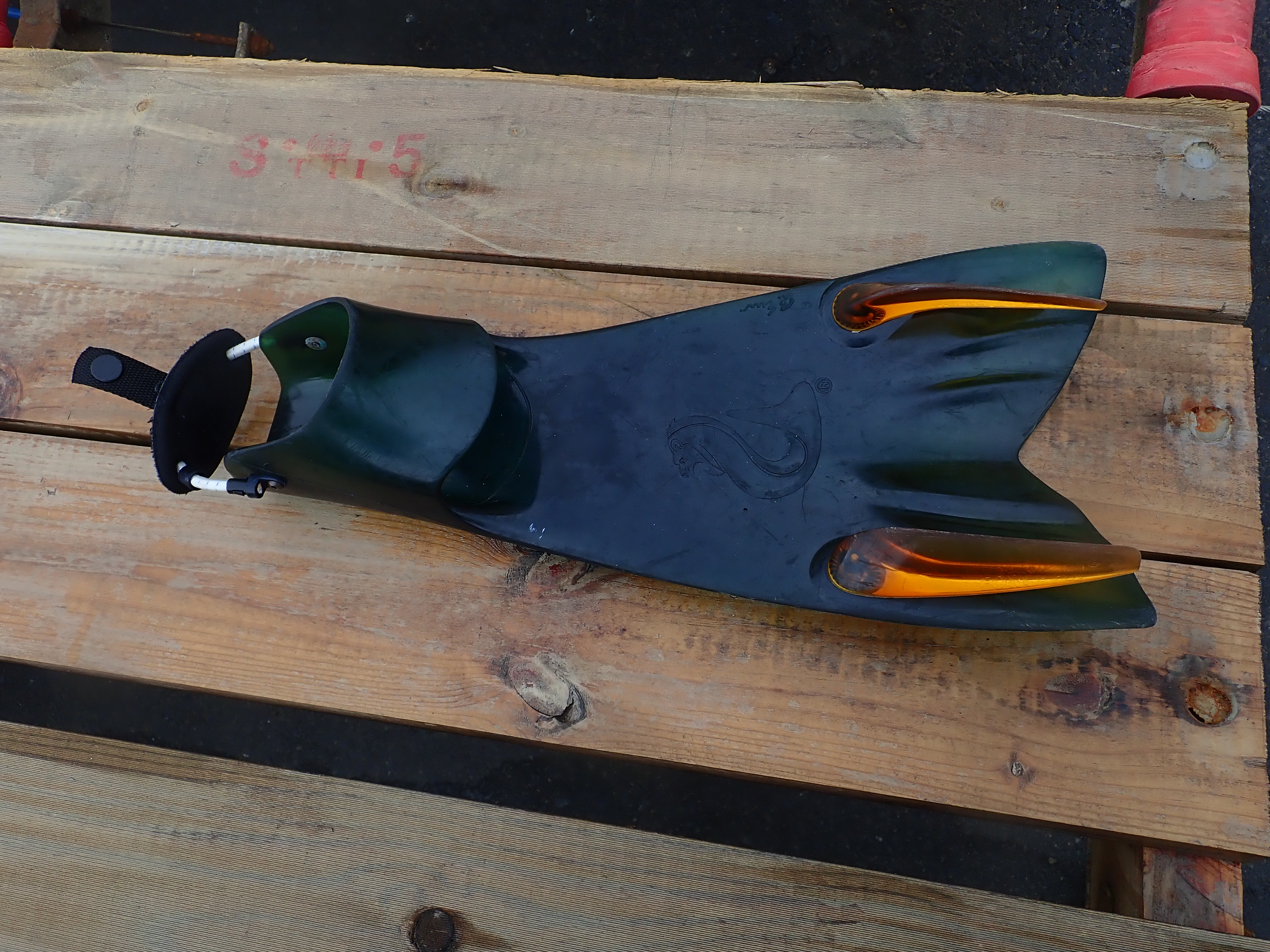 - 프리다이빙 오리발: 패들 핀과 유사하지만 더 길고, 느리고 뻣뻣한 다리 움직임에 맞춰 설계되어 산소와 에너지를 절약한다. 대부분 단단한 풋포켓의 "전신" 디자인으로, 무게를 줄이고 동력 전달을 최대화한다. 플라스틱으로 주로 제작되지만, 유리 섬유나 탄소 섬유 보강 복합재료도 사용된다. 복합 블레이드는 탄력적이지만 약하고 쉽게 손상된다.[27]