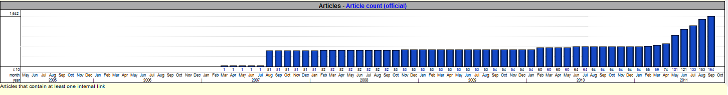 2002년 6월에 시작하여 2011년 5월에 1,000개의 문서에 도달했다.[7][8][9] 현재 문서 수를 기준으로 위키백과 목록에서 순위를 차지하고 있다.[10]