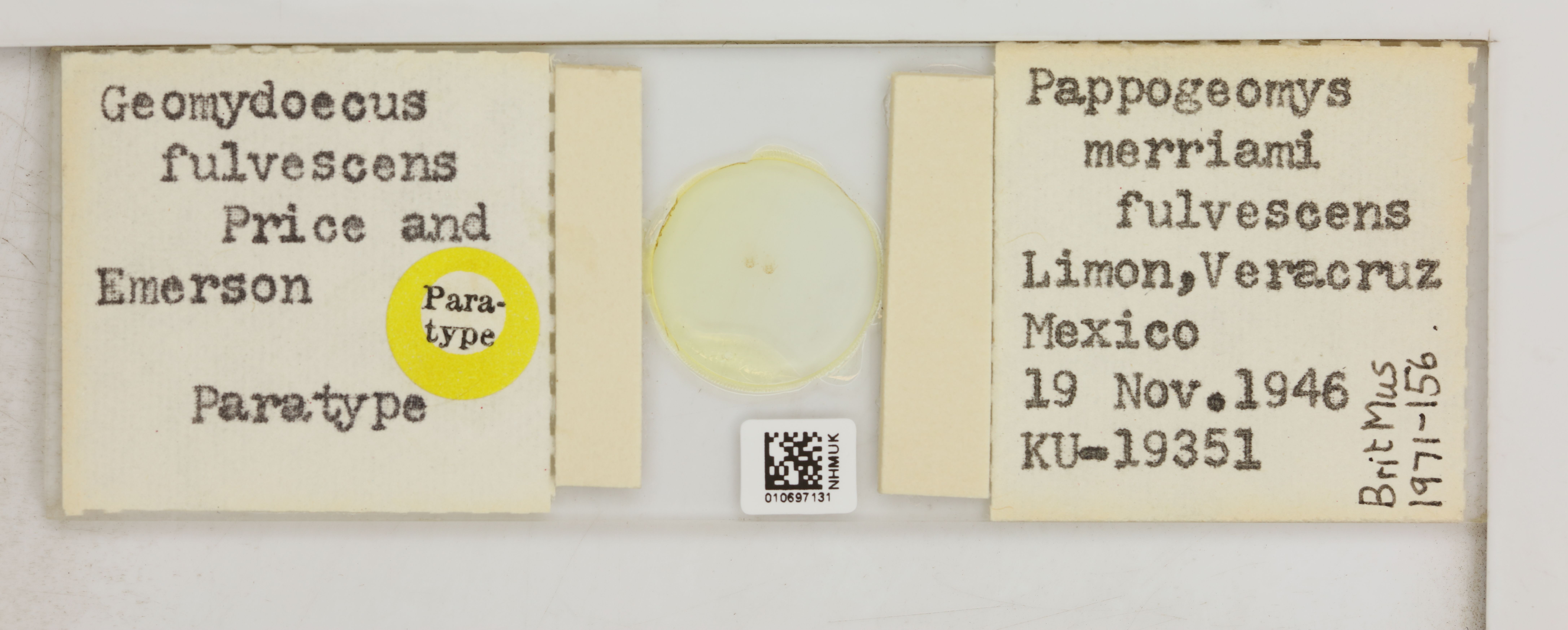 씹는 이 (Phthiraptera) | Geomydoecus fulvescens | 1971년 로저 D. 프라이스와 K. C. 에머슨이 기술 |