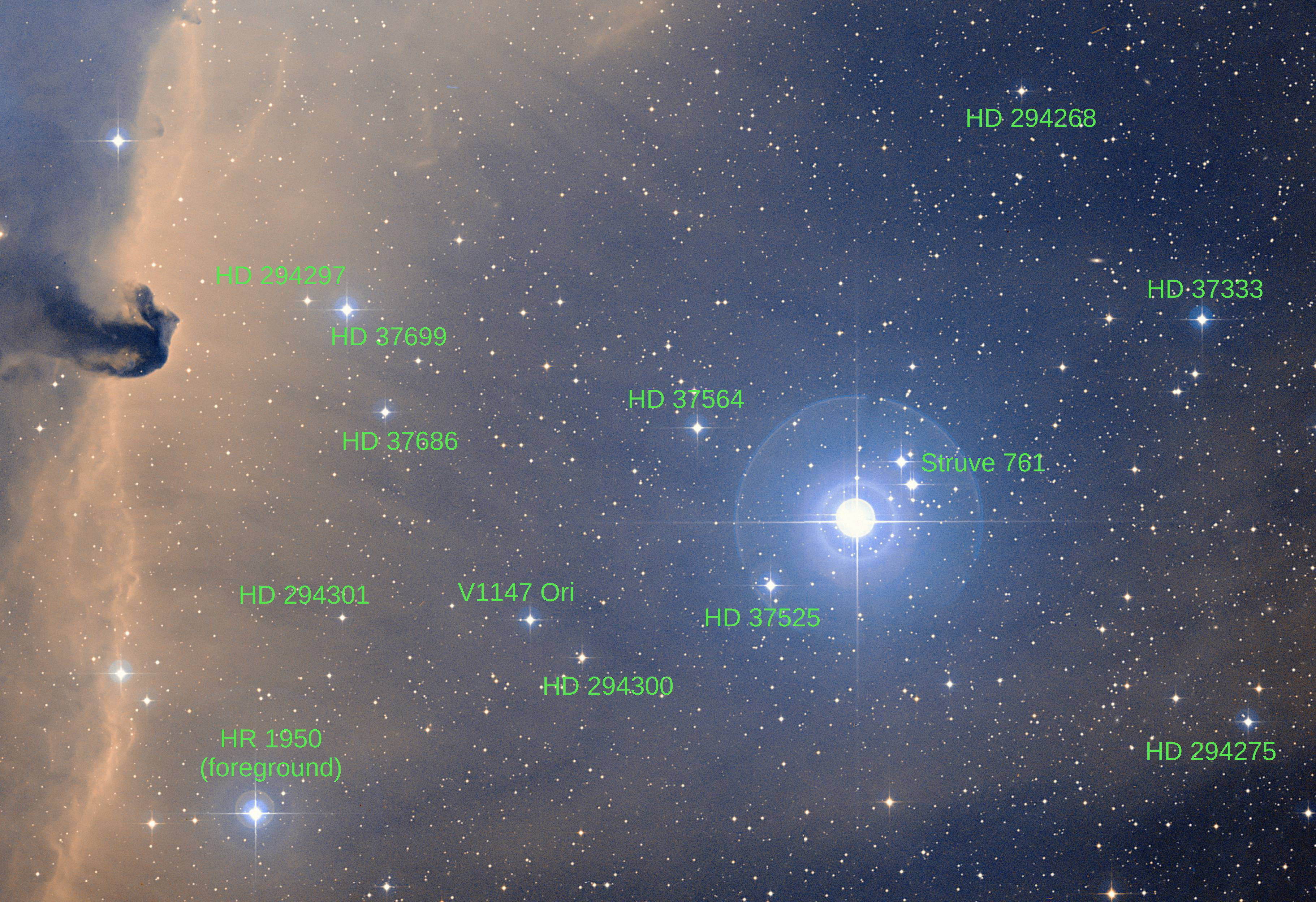 오리온자리 시그마(σ Ori)는 오리온자리의 허리띠 동쪽 끝에 위치한 다중성계로, 고대부터 알려져 왔다. σ 오리온자리는 σ Ori A, B, C, D, E, IRS1로 구성되어 있으며, σ 오리온자리 성단은 Ori OB1b 성협의 일부로, 다양한 별과 갈색 왜성을 포함한다. 특히, σ Ori E는 헬륨이 풍부하고 강한 자기장을 가진 변광성으로, 1.19일의 자전 주기를 가지며 자기장의 변화에 따라 밝기가 변한다. 또한, σ Ori AB를 중심으로 먼지파가 관측되며, 이는 별의 복사압에 의해 분자 구름에서 먼지가 떨어져 나가 형성된 것이다. 가이아 우주선의 관측에 따르면, 이 다중성계와 성단까지의 거리는 약 391 ± 50 pc이다.