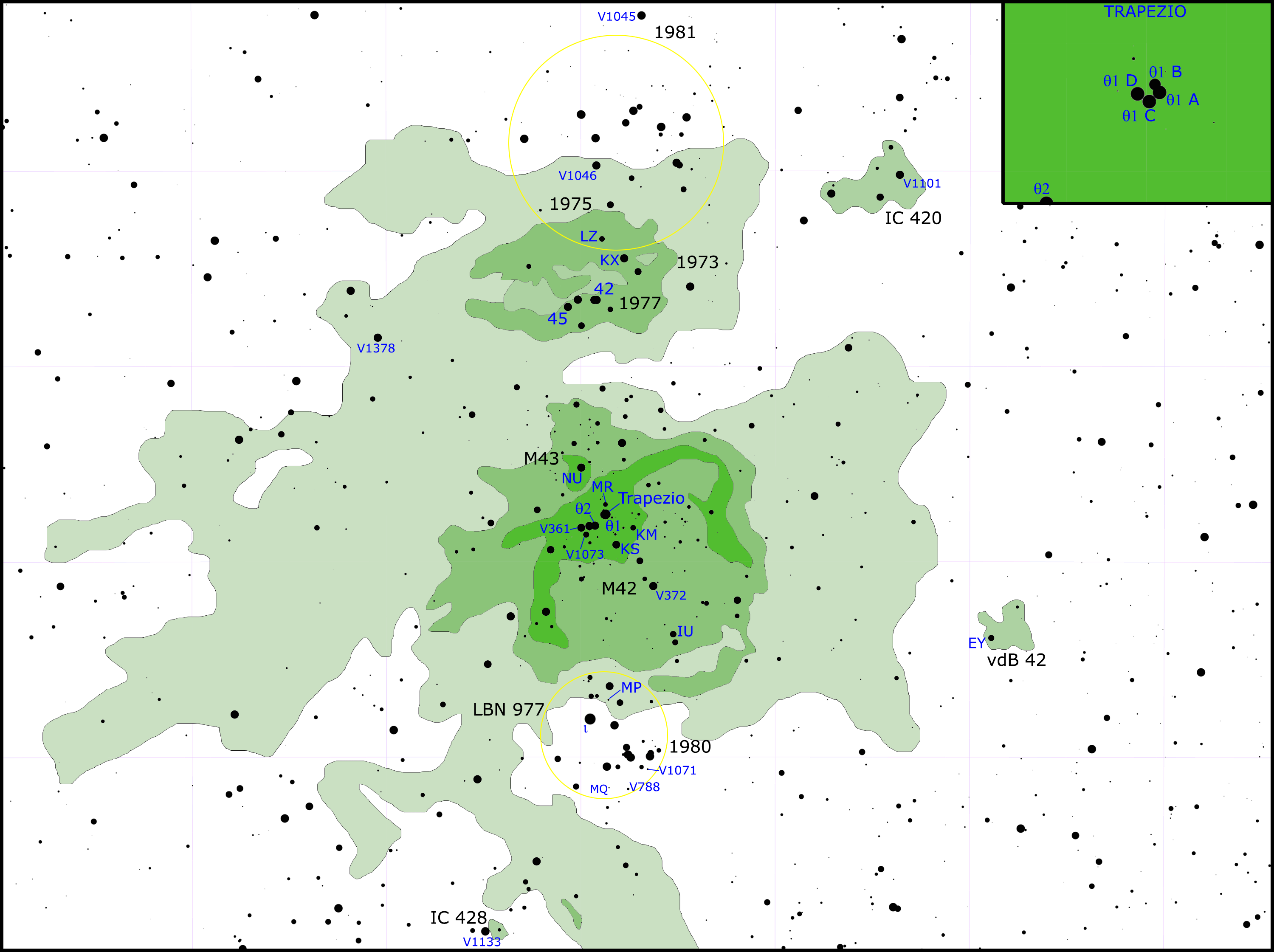 1979년 피크 뒤 미디 천문대 관측과 이후 초장기선 간섭계(VLA) 관측을 통해 트라페지움 성단 근처에서 부분적으로 이온화된 구상체(PIGs)와 태양계 크기의 응축체가 발견되었다. 이들은 증발하는 원시별 강착 원반으로 둘러싸인 저질량 별일 가능성이 제기되었다.[42][43]