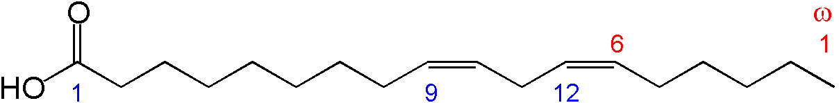 리놀레산(18:2, ''n''−6)은 인체 내에서 합성되지 않아 필수 지방산으로 분류된다. 포유류는 오메가-3 불포화효소가 없어 오메가-6 지방산을 오메가-3 지방산으로 전환할 수 없다. 오메가-3 지방산과 오메가-6 지방산은 동일한 효소에 대해 경쟁적으로 작용하므로,[53] 식단에서 이 둘의 비율이 중요하다.