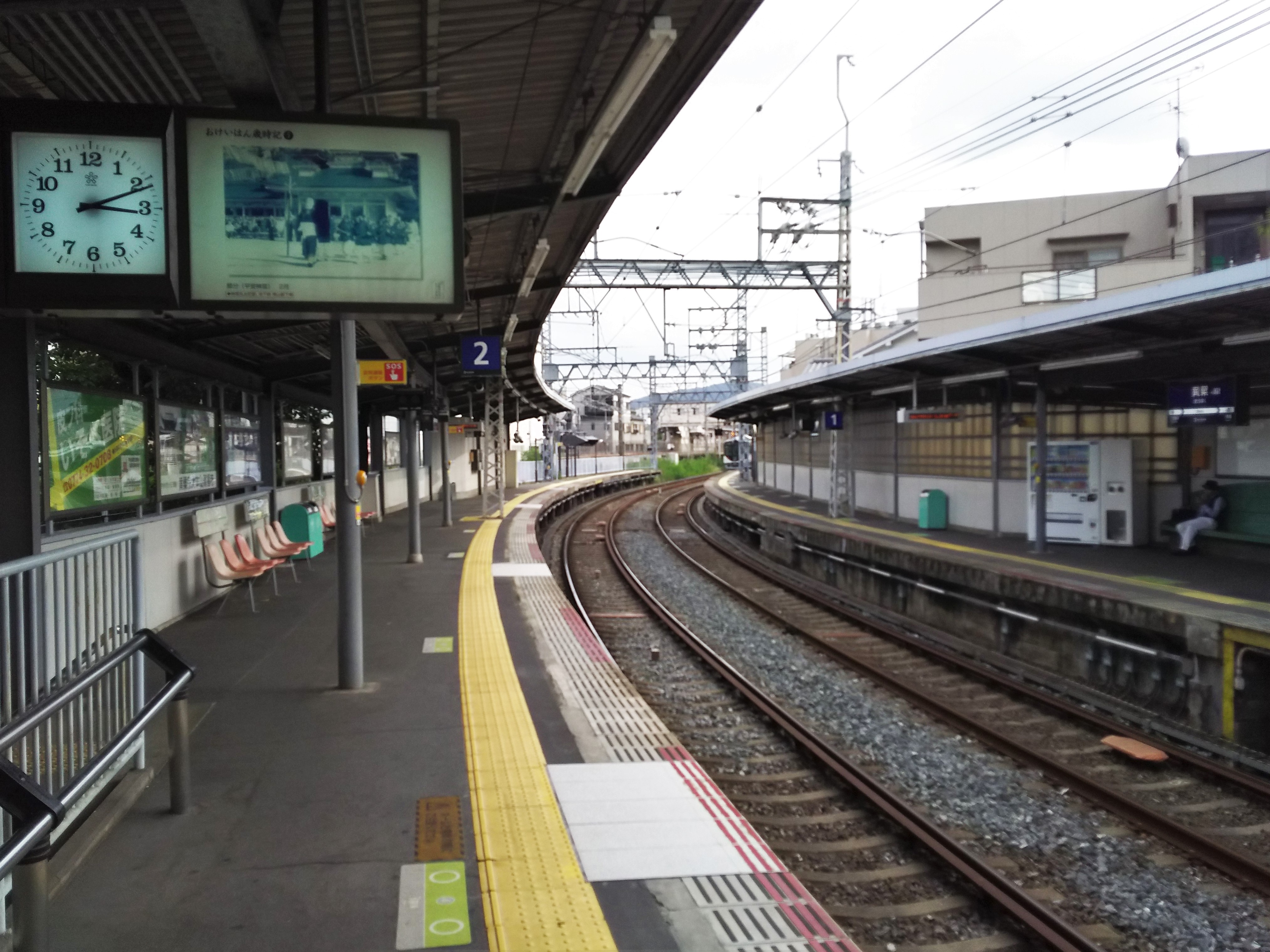 게이한 역과 JR 서일본 역은 직접 연결되지 않은 별개의 건물이다. 두 역 모두 상대식 승강장 2면 2선을 갖춘 지상역 형태이다.[16]