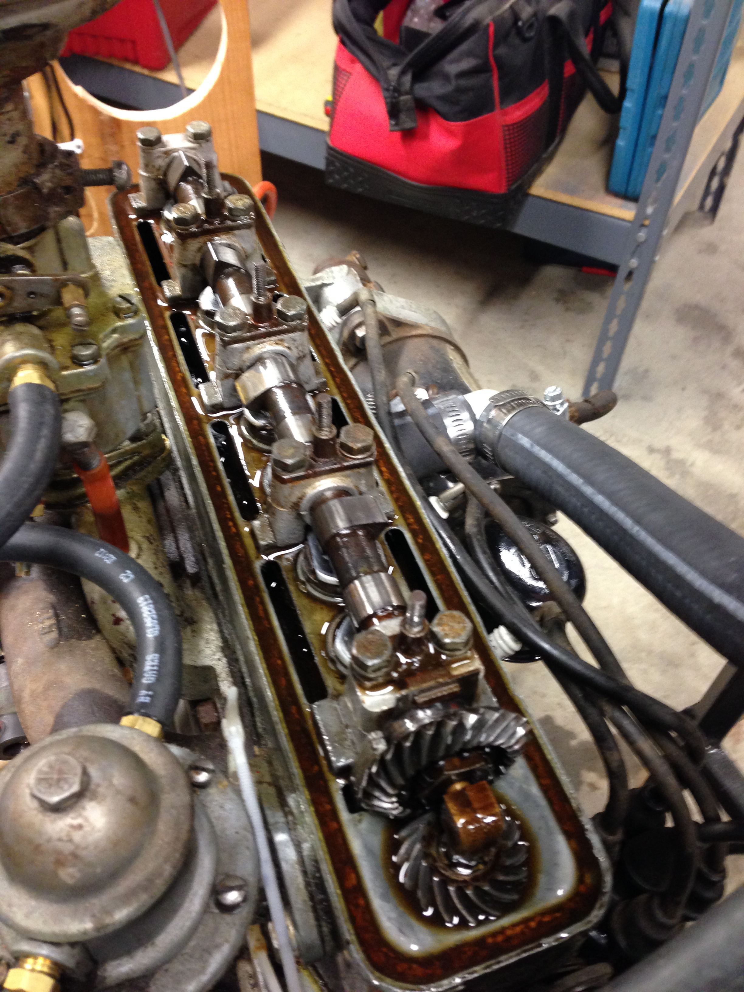 기어 기구 시스템은 크랭크축과 캠축 사이에서 대형 트럭에 사용되는 디젤 오버헤드 캠샤프트 엔진에서 일반적으로 사용된다.[16] 기어 기구는 소형 트럭이나 자동차 엔진에서는 일반적으로 사용되지 않는다.[1]1950년대까지 여러 OHC 엔진은 캠축을 구동하기 위해 베벨 기어가 있는 샤프트를 사용했다. 다음은 그 예시이다.