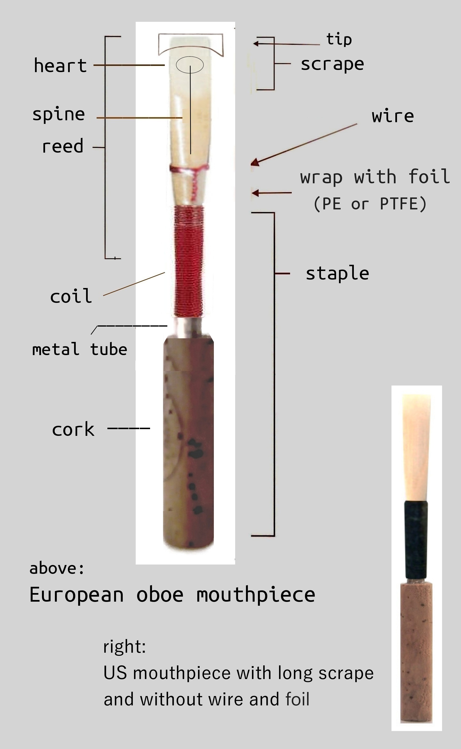 발음체인 리드는 소모품이다. 리드는 악기점에서 구입하거나, 연주자 자신이 제작한다. 리드의 설계에 따라 전 음역에서의 음정 밸런스, 제1, 제2 옥타브의 음정 밸런스, 피치, 고음 발음의 용이함, 음색 변화의 폭, 아티큘레이션의 용이함, 그 변화의 폭, 엠부셔에의 부담 등에 큰 영향을 미치기 때문에, 리드에도 국가, 사용하고 있는 악기의 메이커, 또 그 모델에 의한 스타일의 차이가 보인다. 미국에서는 롱 스크레이프라고 불리는 리드의 5분의 4에서 3분의 2 정도가 깎여 있는 것이 주류이다. 유럽에서는 숏 스크레이프라는 리드의 절반 이하의 부분이 깎여 있는 것이 주류이지만, 영국에는 약간 다른 형태의 롱 스크레이프의 전통이 있으며, 독특한 악기로 알려진 빈의 스크레이프도 길다.