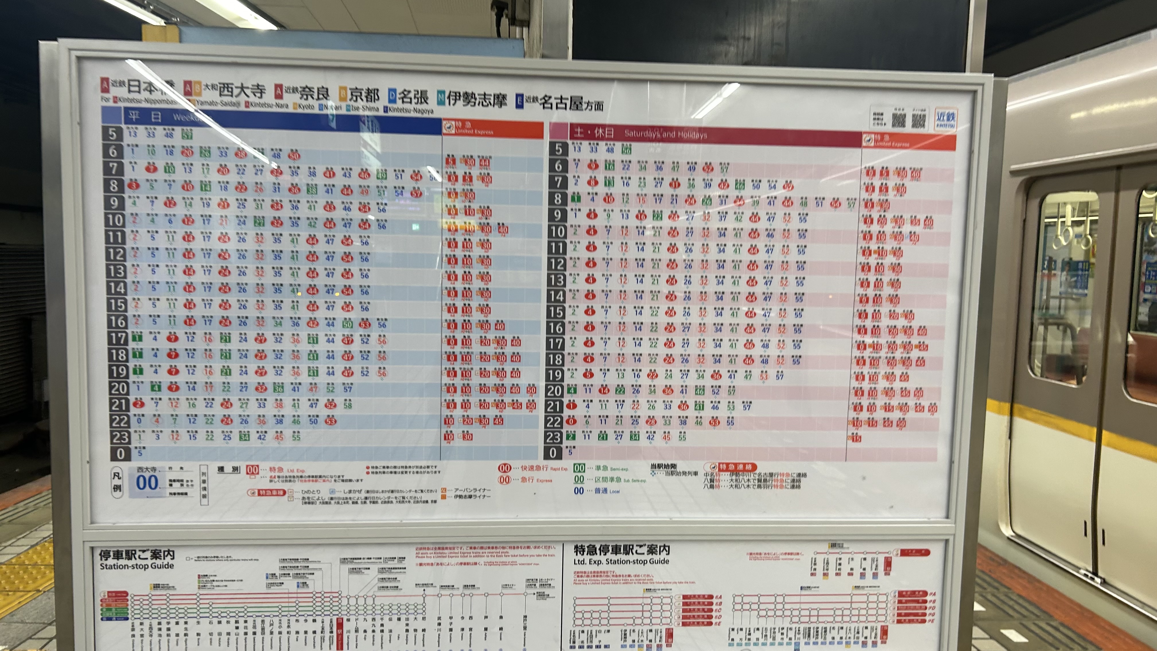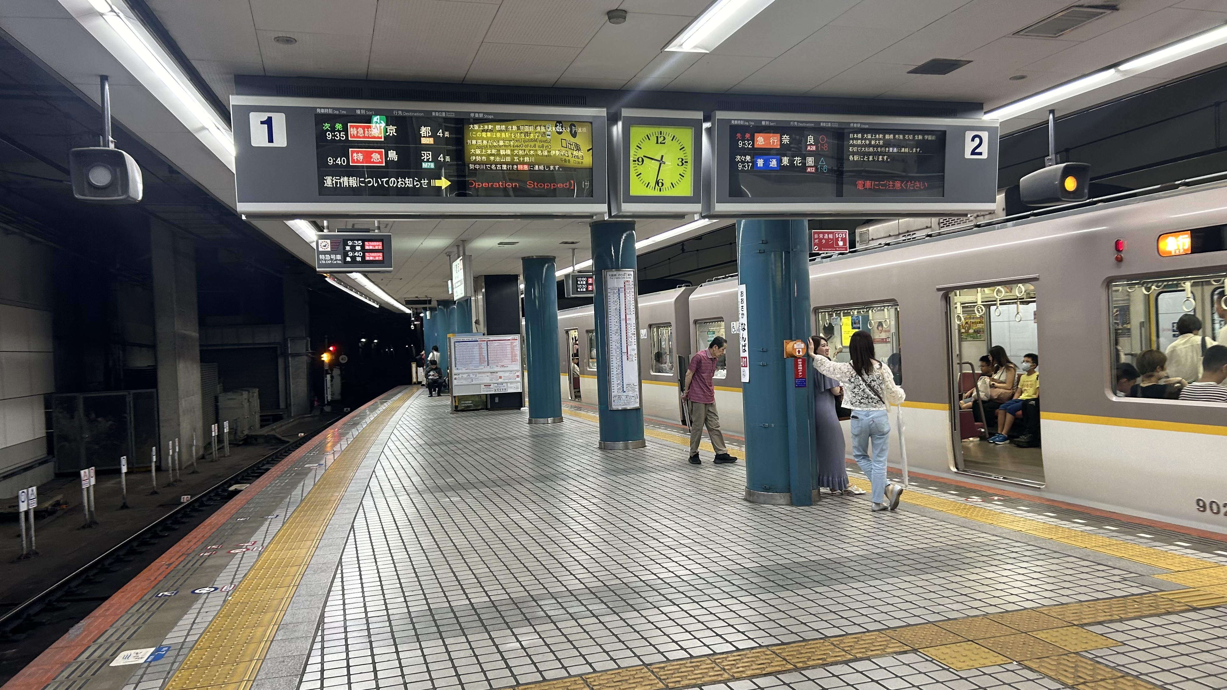 낮 시간대에는 매시 정각에 긴테쓰나고야행 갑특급 "히노토리", 10시 이후 10분에는 가시코지마행[20], 30분에는 긴테쓰나고야행 을특급 "어반 라이너"가 출발한다. 매시 50분대의 우지야마다・도바행 을특급은 오사카우에혼마치역에서 출발하지만, 6시 40분 우지야마다행 특급, 20시~22시 매시 50분에는 당역에서 마쓰사카, 나바리행 을특급이 운행한다. 저녁 이후에는 나라행 특급이 늘어나고, 이세시마 방면으로도 가시코지마행 특급 대신 도바・마쓰사카・나바리행 특급이 출발하여, 낮 시간대와 마찬가지로 긴테쓰나고야행 매시 정각 갑특급과 30분 을특급[21]을 포함해 1시간당 5~6편이 운행된다.4. 2. 일반 열차