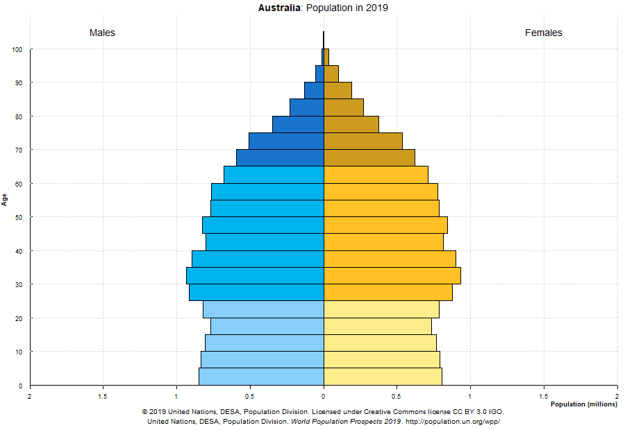 오스트레일리아의 인구는 1950년 817만 명에서 1990년 1696만 명으로 두 배 증가했으며, 2015년에는 2393만 명으로 증가했다. 2019년 유엔의 인구전망에 따르면, 오스트레일리아의 인구는 2030년 2817만 명으로 증가하며, 그 이후에도 계속증가해 2100년 4287만 명에 달할 것으로 예상하였다.[114]