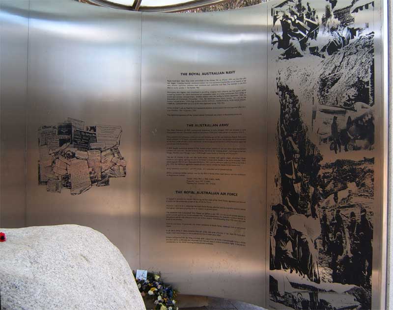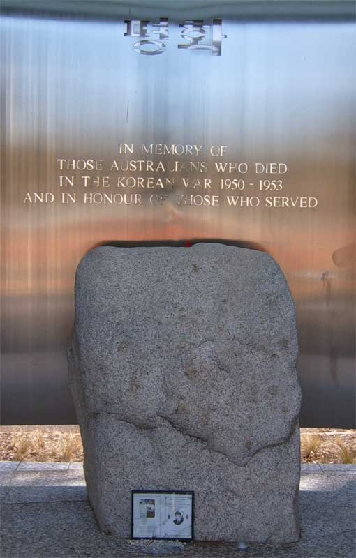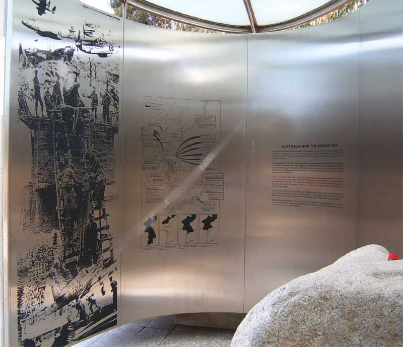 중앙 통로를 따라가면 반쯤 폐쇄된 명상의 공간이 나온다. 한국 전장의 바위에는 한글로 "평화와 독립"이라는 글귀가 새겨져 있다. 이곳은 주요 기념 지점이다. 내부에는 한국 전쟁에 참전한 호주인들의 이야기를 담은 이미지, 지도, 텍스트가 스테인리스강 패널에 새겨져 있다. 왼쪽에는 일반적인 이야기가, 오른쪽에는 호주 해군(9척의 함선과 1개 비행대), 호주 육군(3 RAR, 1 및 2 RAR의 일부), 호주 공군(77 비행대 및 기타 구성 요소)의 특별한 참여 내용이 담겨 있다.2. 3. 기타