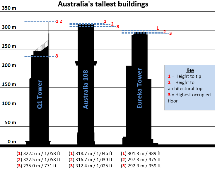 호주 108, Q1 타워(왼쪽)와 유레카 타워(오른쪽) 사이의 높이 비교