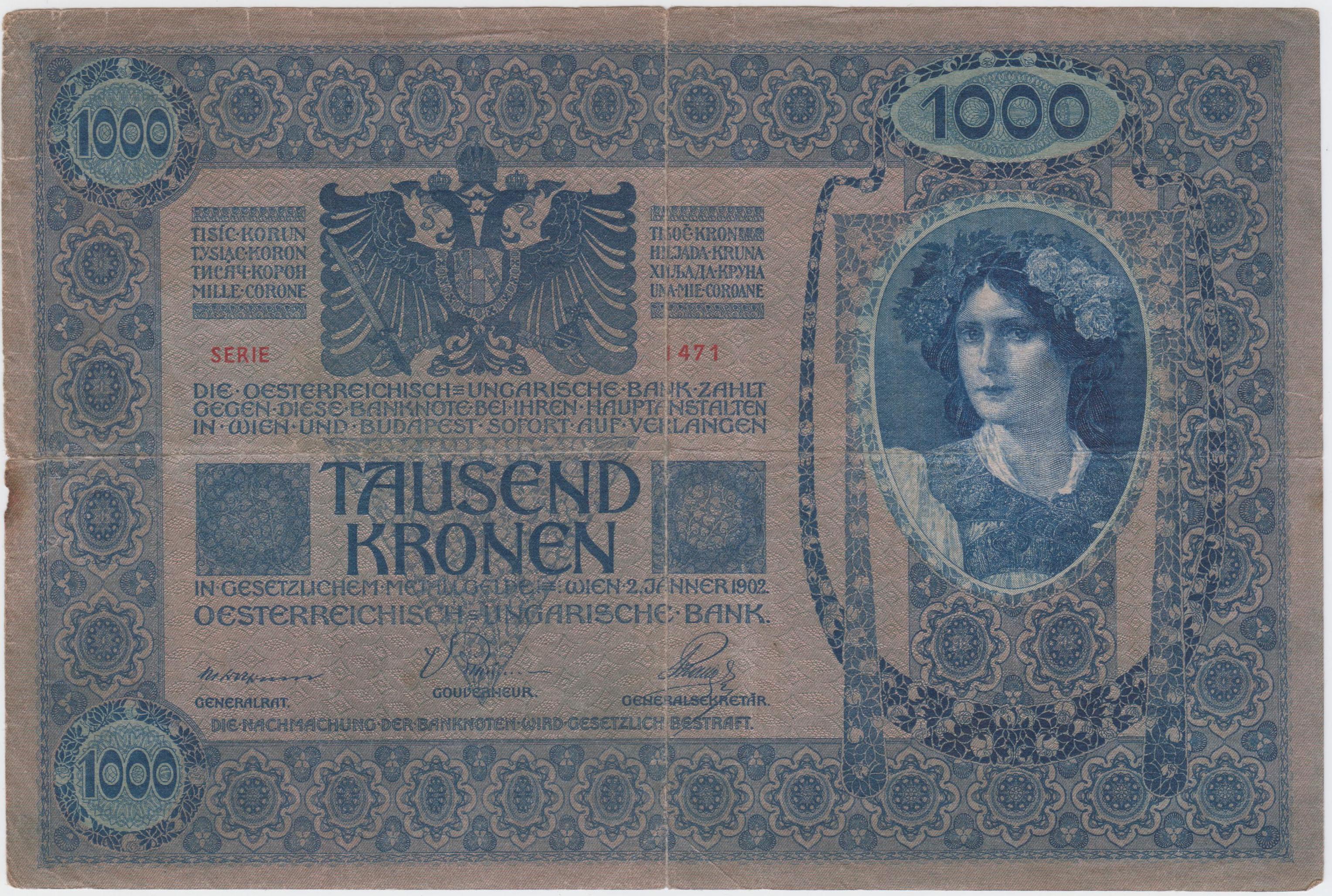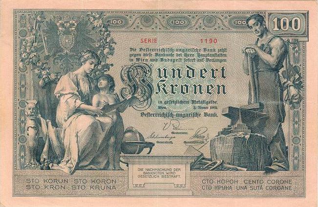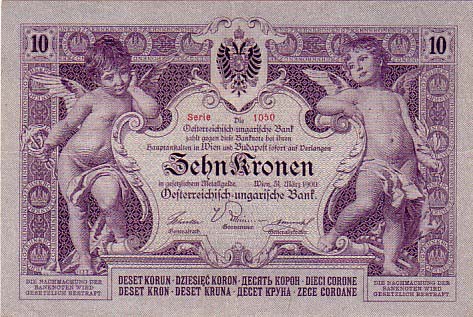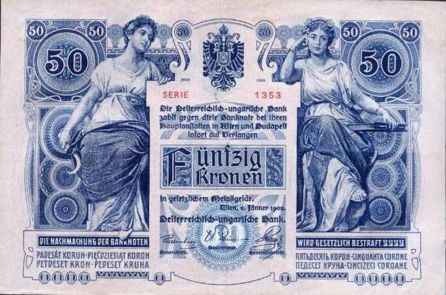몇 차례의 초기 시도 끝에 오스트리아-헝가리 제국은 헝가리 재무장관 산도르 베케를레가 작성한 계획에 따라 1892년에 금본위제를 채택했다. 이 계획에는 새로운 통화인 크로네의 도입이 포함되었다. 크로네는 100 헬러(Heller, 오스트리아) 또는 필러(Fillér, 헝가리)로 구성되었다. 크로네의 가치는 2크로네 = 1굴덴(gulden)으로 설정되었다. 1900년 이후로 크로네 지폐는 제국에서 유일한 법정 지폐가 되었다.3. 2. 제1차 세계 대전과 몰락 (1914년 ~ 1918년)