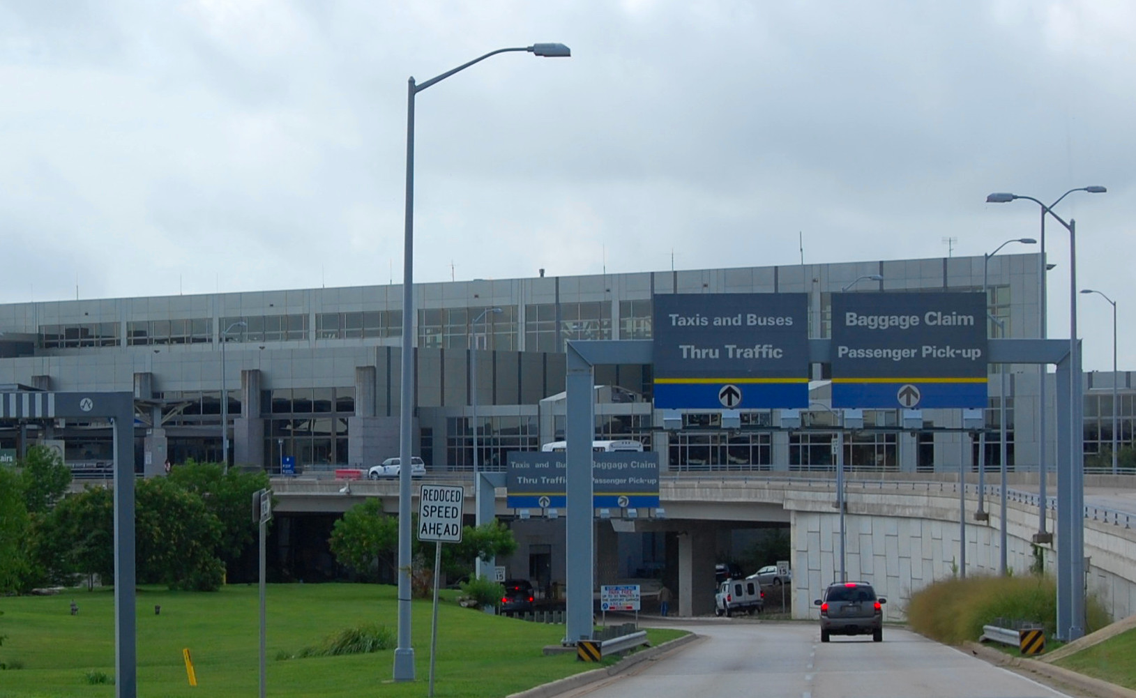 오스틴 버그스트롬 국제공항으로 접근하는 모습. 위쪽 도로는 출발, 아래쪽 도로는 도착을 위한 것이다.