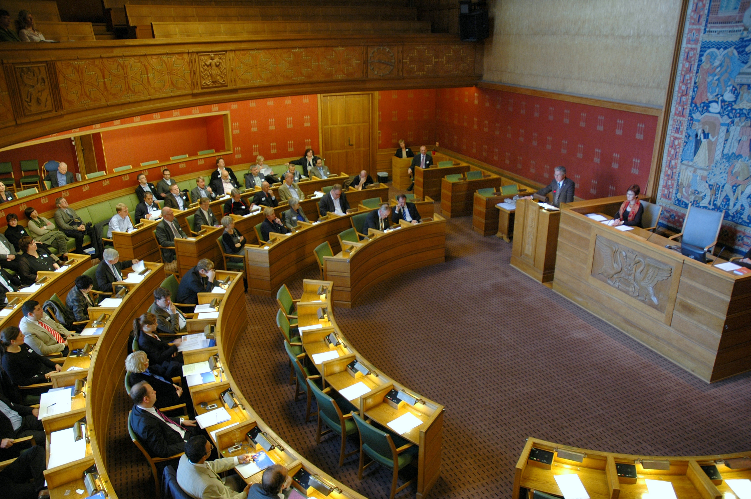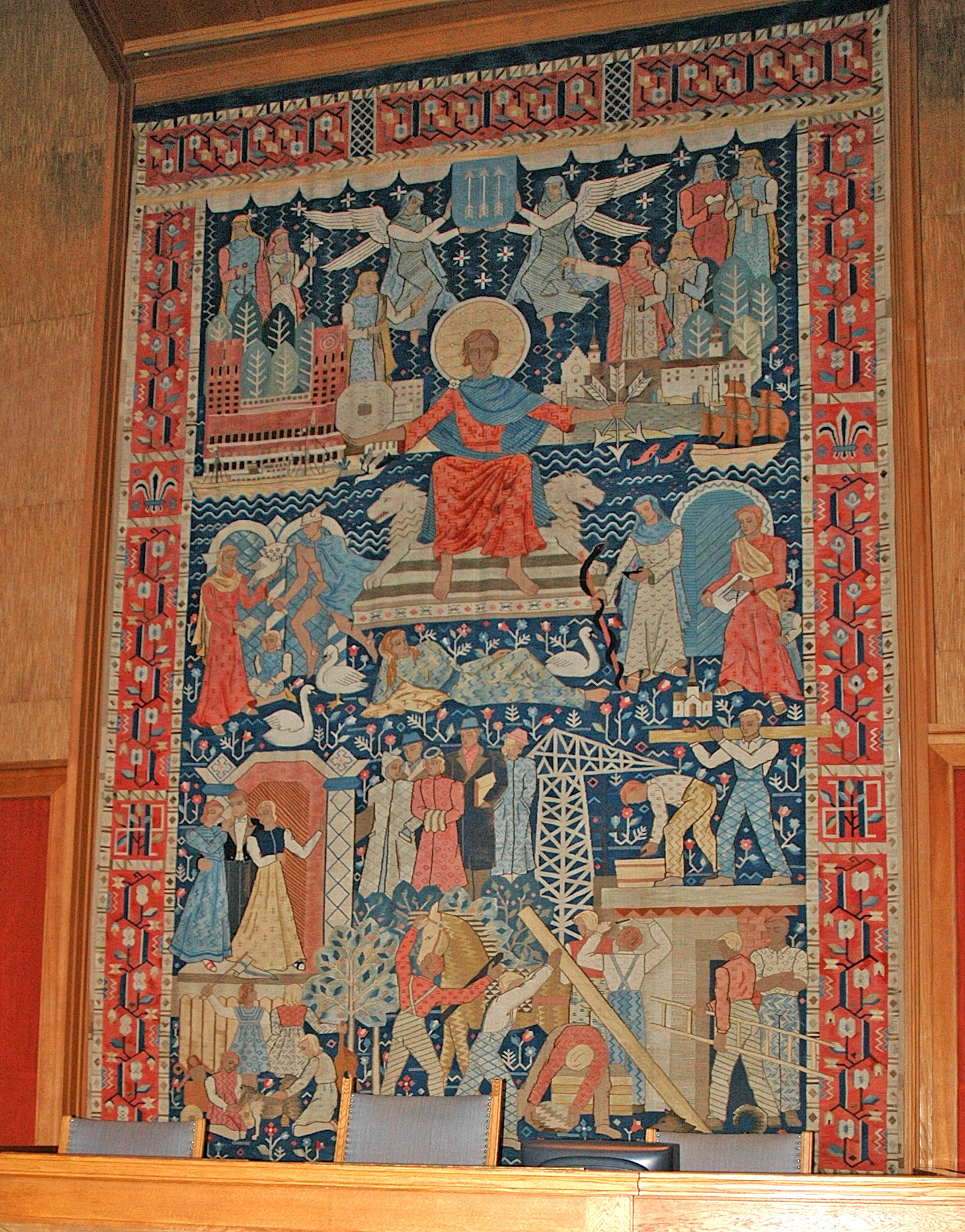 시의회가 열리는 방(Bystyresalen)은 반원형이다. 참나무와 태피스트리로 덮여 있으며, 가장 눈에 띄는 것은 건축가의 조카인 엘스 폴슨이 디자인했다. 엘스 할링이 짠 이 태피스트리는 성 할바르와 일곱 가지 덕목을 묘사한다. 작가는 이 디자인이 도시의 정치인들에게 윤리와 올바른 의사 결정을 상기시켜 주기를 바랐다.