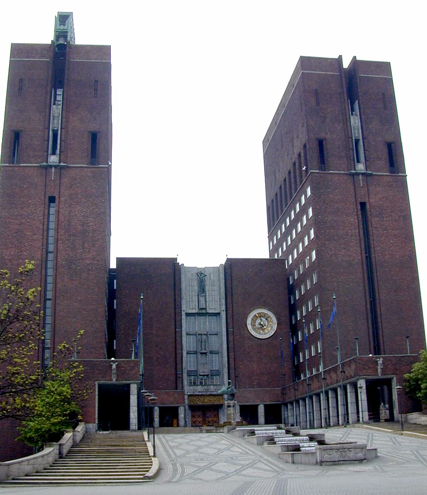 오슬로 시청사는 노르웨이 오슬로에 위치한 시청 건물이다. 중세 시대에는 여러 건물이 시청 기능을 수행했으며, 1641년에는 현재 감레 라드후스로 불리는 건물이 완공되었다. 1906년 새로운 시청사 건립 아이디어가 제안되었고, 여러 차례의 공모전을 거쳐 아르네슈타인 아르네베르그와 마그누스 풀손의 설계가 최종 선정되었다. 1931년 기공식을 거쳐 1950년 5월 15일, 오슬로 900주년 기념 행사의 일환으로 공식 개관했다. 시의회 홀과 메인 홀은 다양한 예술 작품으로 장식되었으며, 건물 외부에는 조각상들이 배치되었다. 매년 12월 10일에는 노벨 평화상 시상식이 열린다.