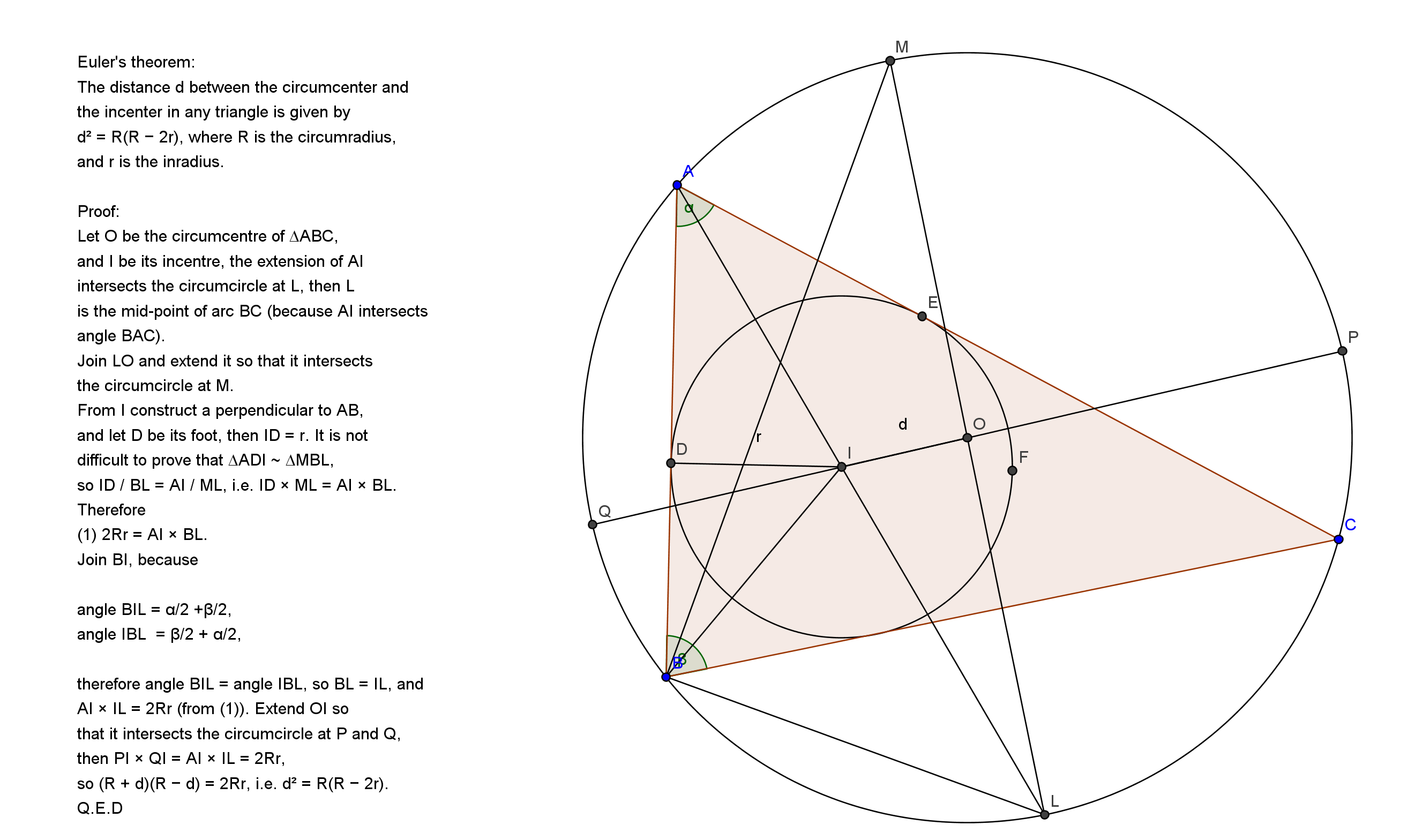 삼각형 의 외심을 , 내심을 라고 하고, 를 지나는 외접원의 지름을 라고 하자. 의 이등분선의 연장선과 외접원의 교점을 이라고 하고, 의 연장선과 외접원의 교점을 라고 하자. 를 지나는 의 수선의 발을 라고 하자. 그렇다면 방멱 정리에 의하여