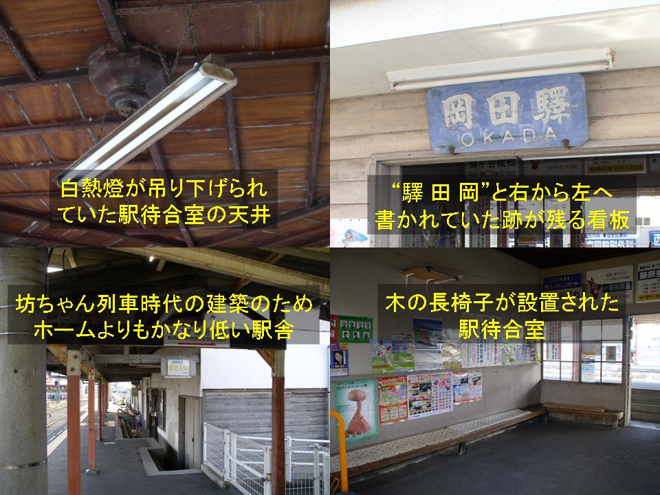 오카다역은 일본 에히메현 이요시에 있는 이요 철도 군추 선의 역이다. 1910년 7월 18일에 영업을 시작했으며, 상대식 승강장 2면 2선의 지상역으로 운영된다. 열차 교환이 가능하며, 역 주변에는 주택가와 마쓰야마시 농업협동조합 지점, 이요테쓰 버스 정류장 등이 위치해 있다.