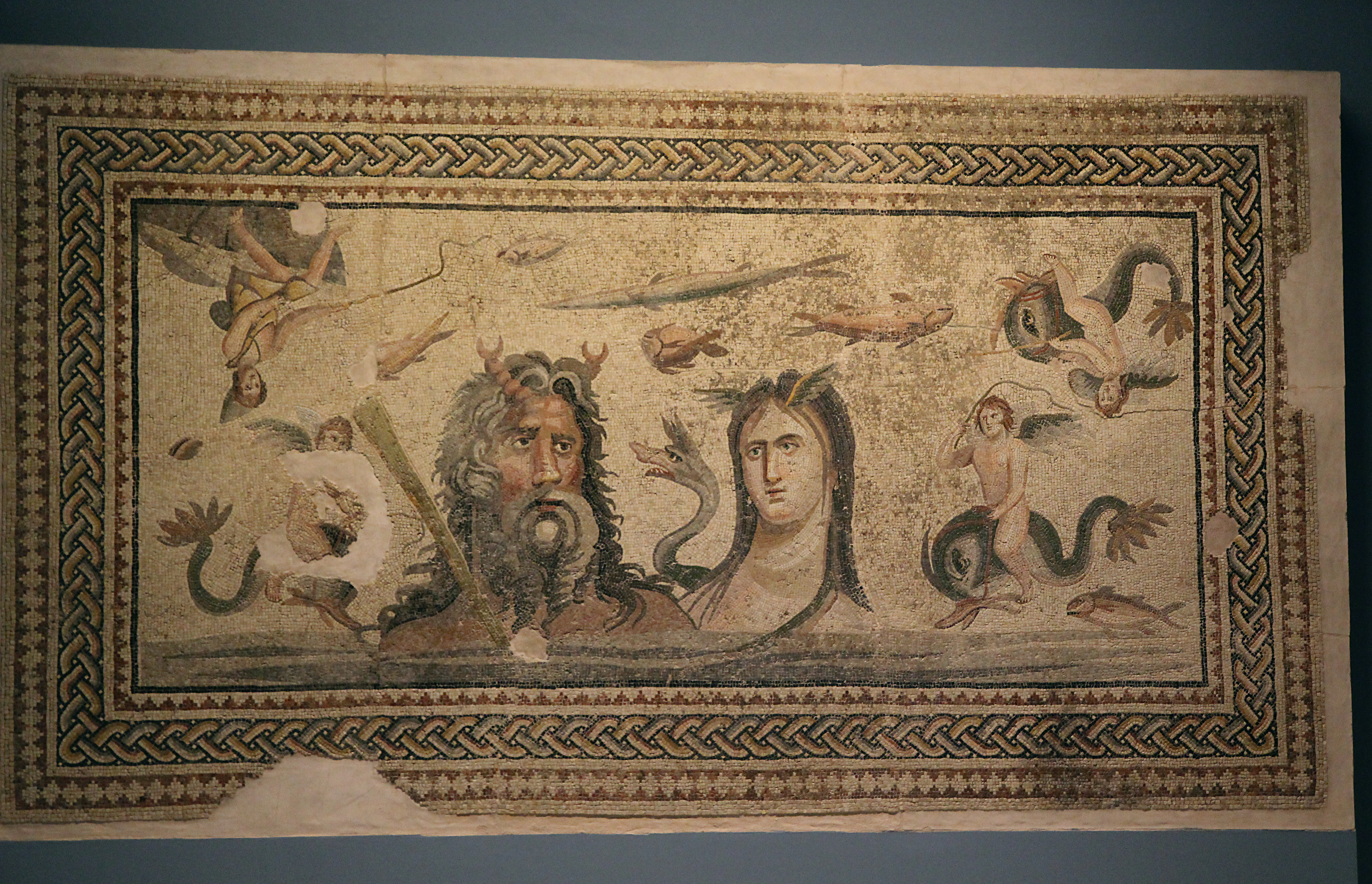 헬레니즘 시대와 로마 시대의 모자이크에서 이 티탄은 종종 근육질의 남자의 상반신에 긴 수염과 뿔(종종 게의 발톱으로 묘사됨)을 가지고, 하반신은 뱀의 모습을 하고 있는 것으로 묘사되었다. 로마 시대의 모자이크에서는 키잡이와 배를 안고 있을 수도 있다.