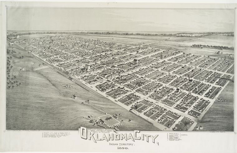 오클라호마시티는 1889년 4월 22일, "미지정지역"으로 알려진 지역이 "토지 러시"라는 사건으로 정착이 허용되면서 건설되었다.[17] 같은 해 4월 26일, 초대 시장인 윌리엄 쿠치가 선출되었다. 약 1만 명의 자유농장 개척자들이 오클라호마 주의 수도가 될 지역에 정착했다. 이 도시는 빠르게 성장하여 1890년과 1900년 사이에 인구가 두 배로 증가했다.[18] 초기 도시 개발 지도자로는 안톤 H. 클라센, 존 윌포드 샤텔, 헨리 오버홀서, 오스카 아메린저, 잭 C. 월턴, 안젤로 C. 스콧, 제임스 W. 메니가 있다.