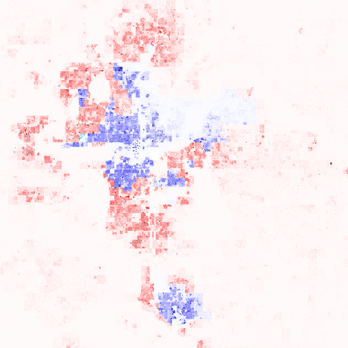 시 경계 면적을 사용한 오클라호마시티의 인구 밀도는 오해의 소지가 있다. 도시화 지역은 약 약 631.95km2이며, 2013년 추산 인구 밀도는 2500/sqmi이다. 반면 시 경계의 나머지 약 976.42km2를 차지하는 농촌 유역 지역은 인구 밀도가 다르다.[41]