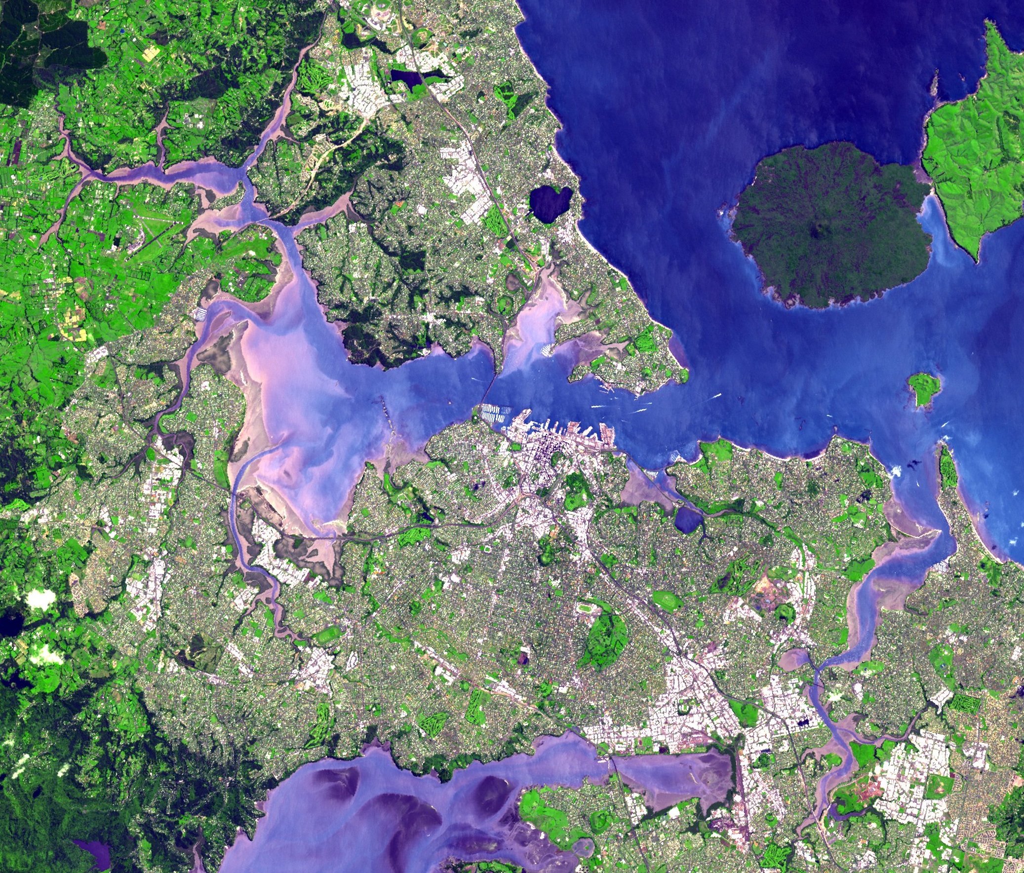 도시 중심부는 오클랜드 지협에 위치하며, 가장 좁은 지점의 너비는 2km가 채 되지 않는다. 이 지협은 망게레 만과 타마키 강 사이에 있다. 이 지협을 둘러싸고 있는 두 개의 항구가 있는데, 북쪽에는 와이테마타 항구가, 남쪽에는 마누카우 항구가 있다. 와이테마타 항구는 동쪽으로 하우라키 만을 통해 태평양으로, 마누카우 항구는 서쪽으로 태즈먼 해로 이어진다.