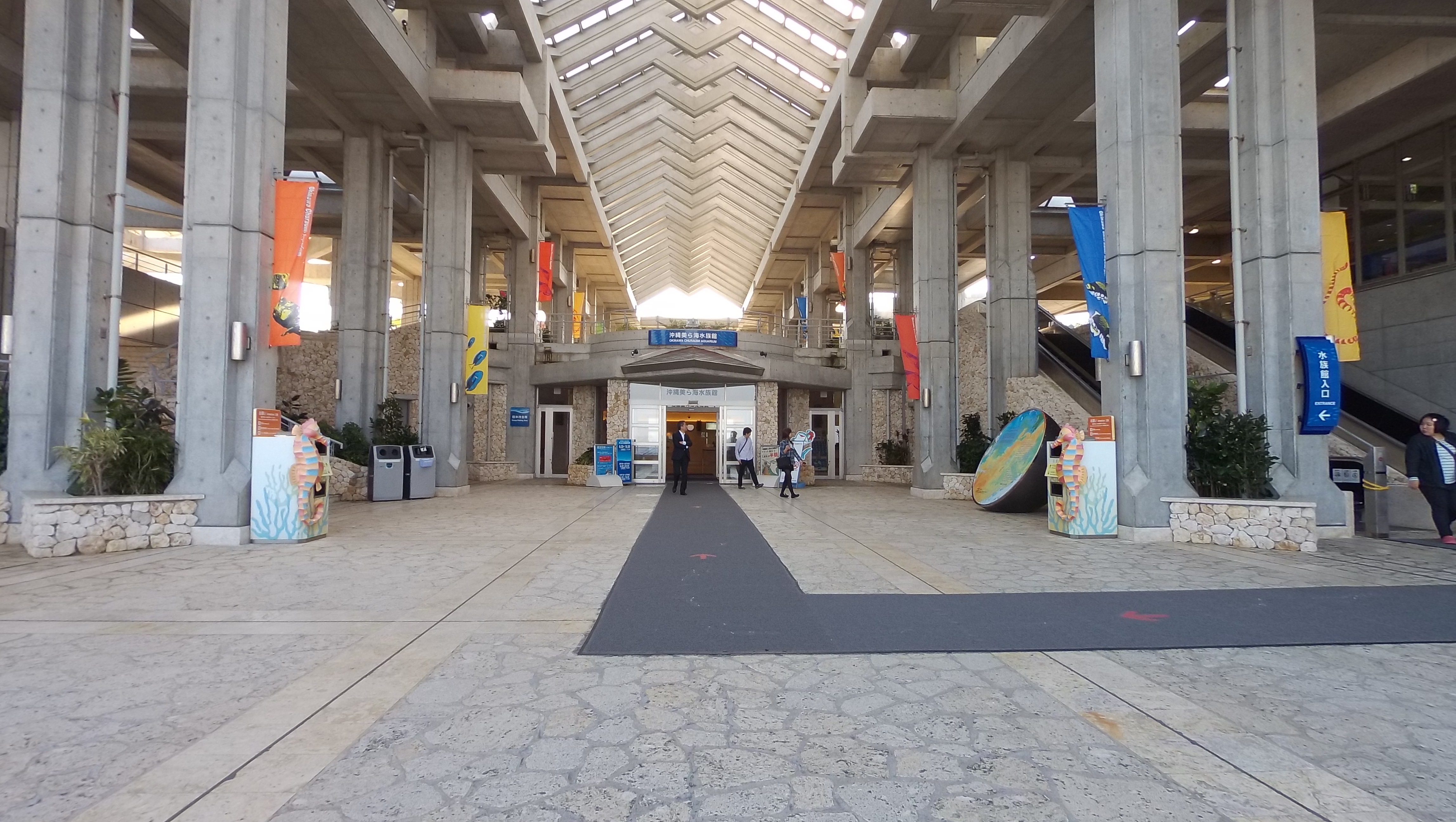 오키나와현 모토부 해양 엑스포 공원 내 위치한 수족관은 4층 건물로, 19000m2 부지에 77개 수조, 10000m3의 물을 보유하고 있다.[26][96] 해수는 350m 거리에서 펌프로 공급된다.[26][96]
