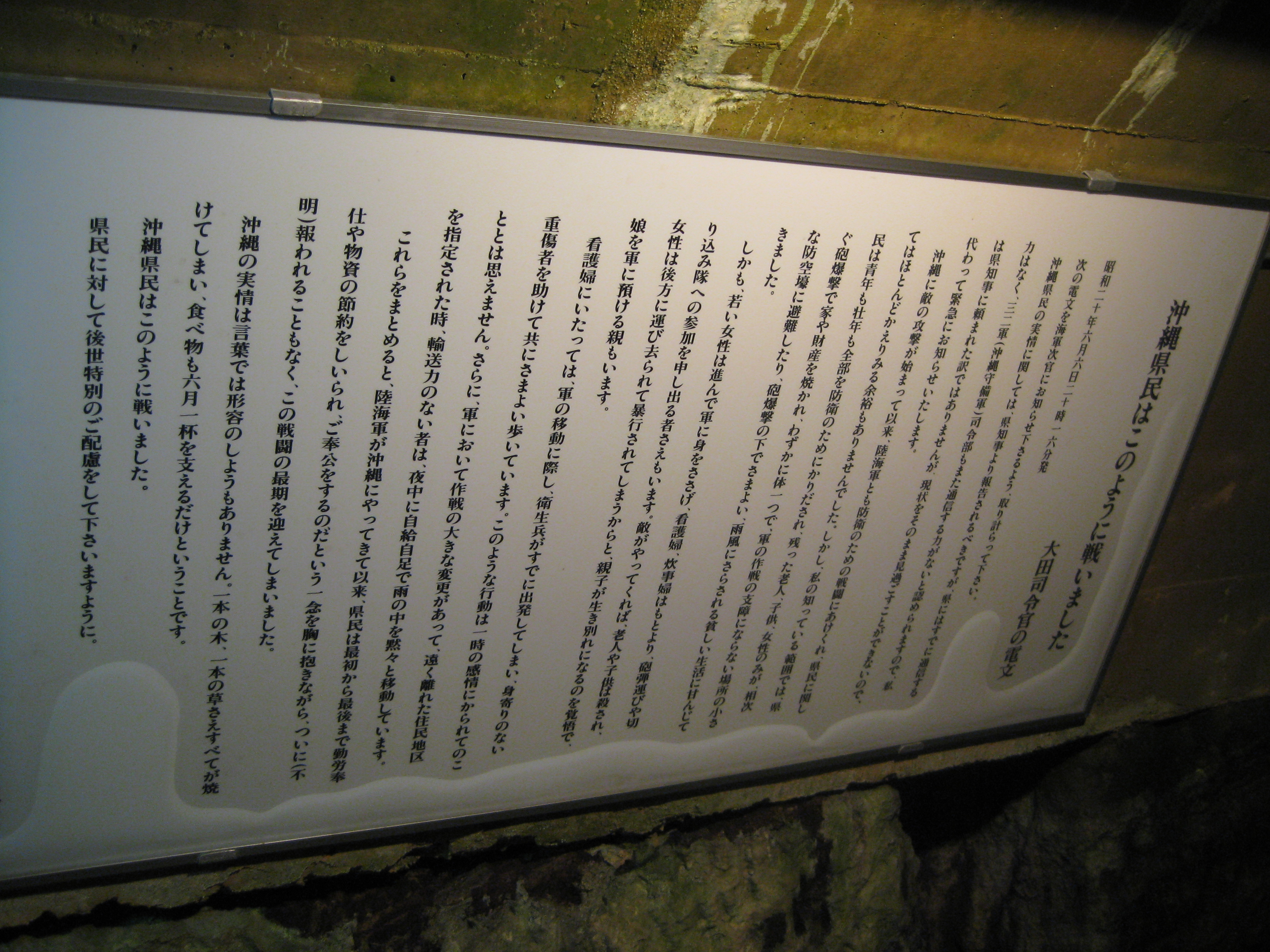 오키나와 본섬에 적이 공격을 시작한 이후, 육해군은 방어전에 전념하여 현민에 대해서는 거의 신경 쓸 겨를이 없었다. 그럼에도 불구하고, 내가 아는 한, 현민은 청년·장년이 모두 빠짐없이 방위 징집에 적극적으로 응했다. 남겨진 노인·어린이·여성은 의지할 사람이 없어지자, 자신들끼리, 게다가 잇따른 적의 포격에 집과 재산을 전부 잃고 옷만 걸친 채, 군의 작전에 방해가 되지 않는 좁은 방공호에 피난하여, 간신히 포격을 피하면서도 비바람에 노출된 채 궁핍한 생활을 견디고 있다.