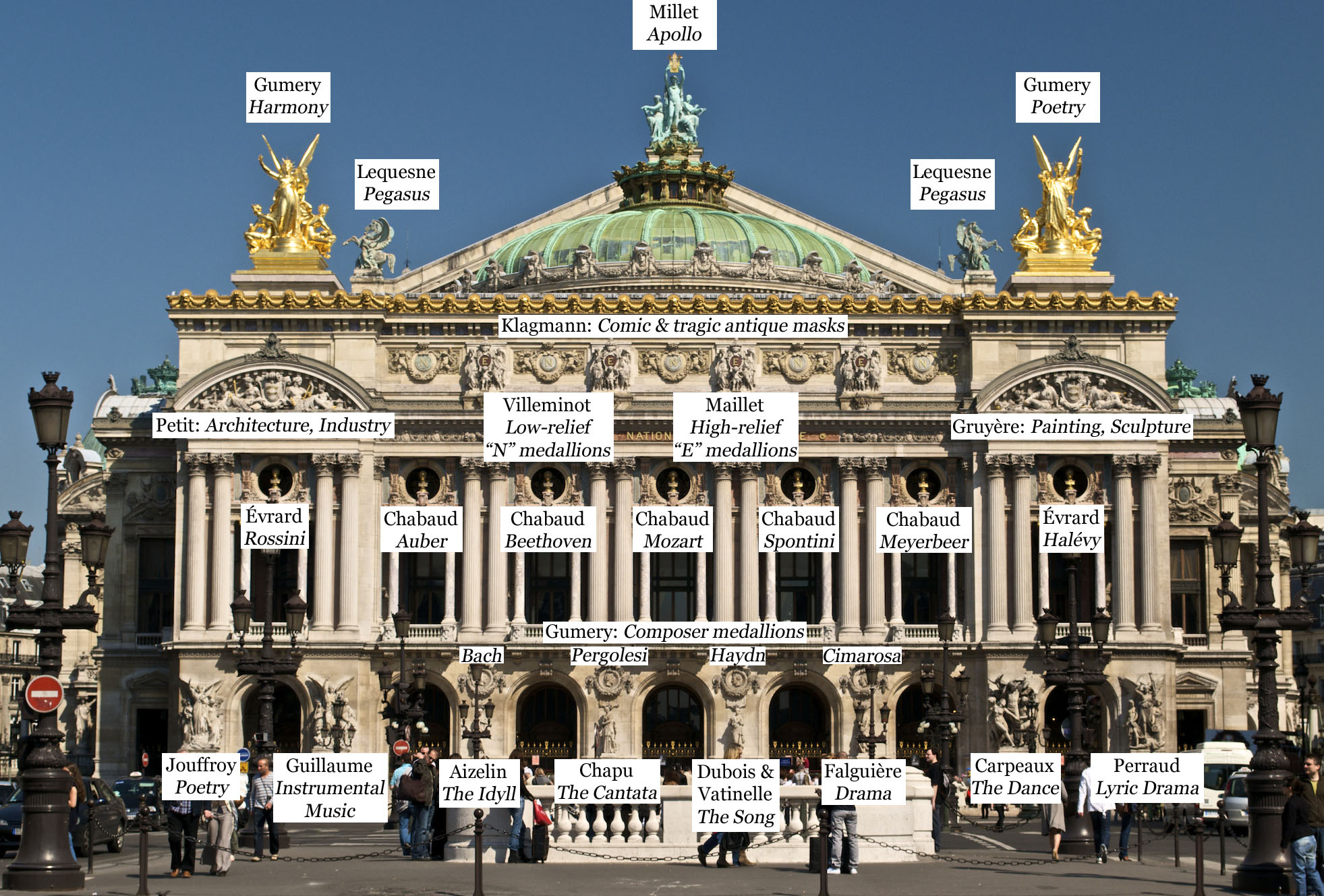 오페라 광장을 향해 있는 주 파사드는 17가지 종류의 재료를 사용하여 다채롭게 장식되어 있으며, 14명의 화가, 모자이크 제작자, 73명의 조각가가 참여했다. 극장 앞 파사드의 기둥 사이에는 로시니, 오베르, 베토벤, 모차르트 등 유명 작곡가들의 금도금된 전주조 청동 흉상이 배치되어 있다.[87]샤를 귀메리의 "화합(L'Harmonie)"과 "시정(La Poésie)"이라는 두 개의 황금 조각상은 주 파사드의 좌우 전면부(전면부) 꼭대기에 설치되어 있다. 이 조각상들은 모두 금 도금된 전주조의 동상이다.