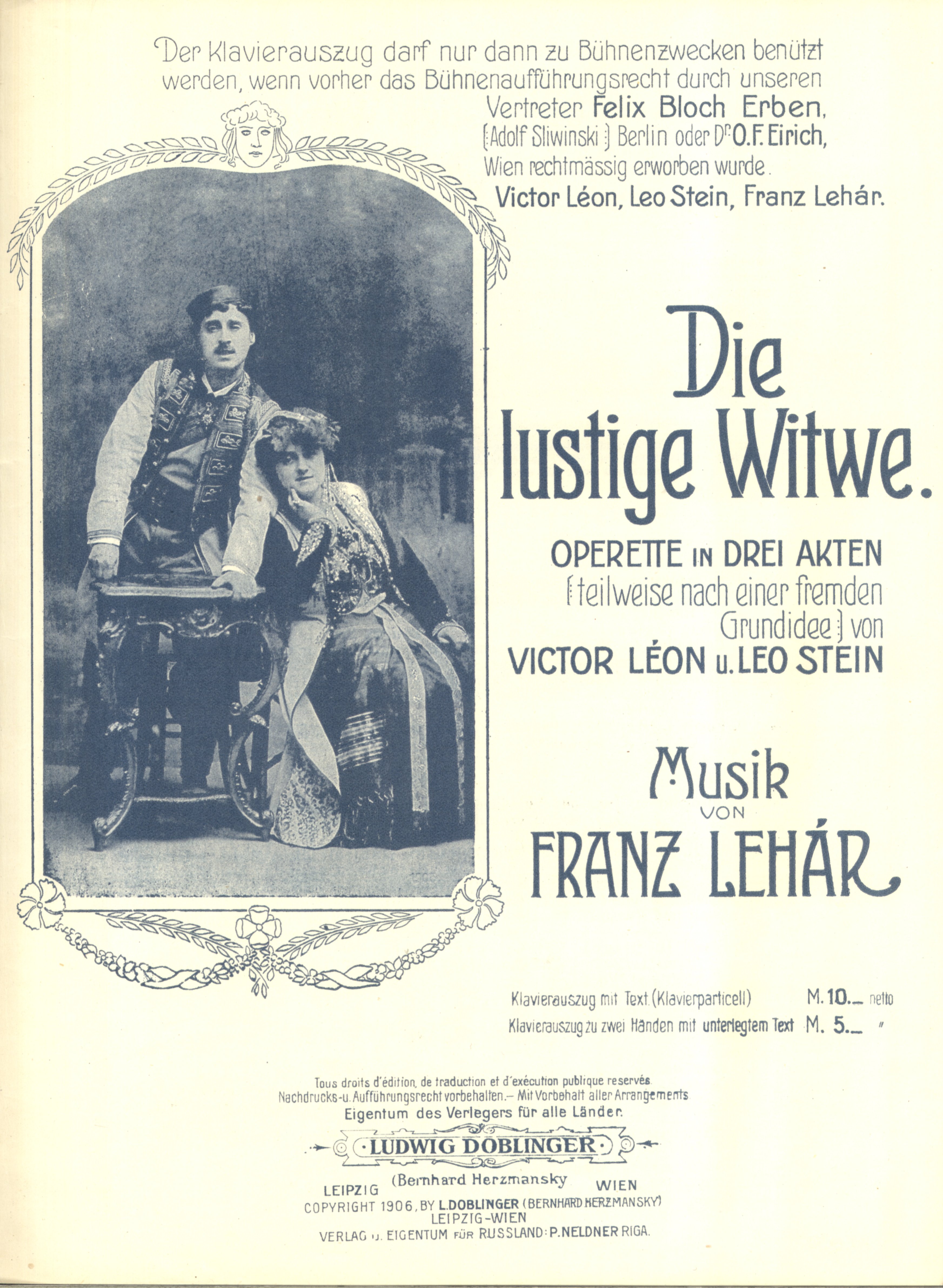 > 1908년 1월, 런던의 ''데일리 메일''은 ''즐거운 미망인''이 빈에서 450회, 베를린에서 400회, 상트페테르부르크에서 350회, 코펜하겐에서 300회 공연되었으며, 현재 유럽에서 9개 언어로 매일 저녁 공연되고 있다고 보도했다. 미국에서는 5개의 회사가 이 작품을 공연하고 있으며, "뉴 암스테르담 극장의 티켓 구매 열기"는 "위기에 처한 은행 문 앞의 열광적인 군중"에 비견되었다. 스탠 체크는 그의 레하르 전기에 따르면 1910년까지 10개 언어로 미국 154개, 독일 142개, 영국 135개 무대에서 "약 18,000회" 공연되었다고 주장한다.[31]