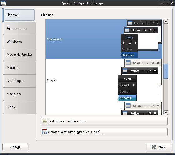 menu.xml영어은 GUI 설정 도구인 ObConf영어, obmenu영어를 사용하거나 수동으로 편집할 수 있다.[4][17][18]2. 2. GUI 설정 도구