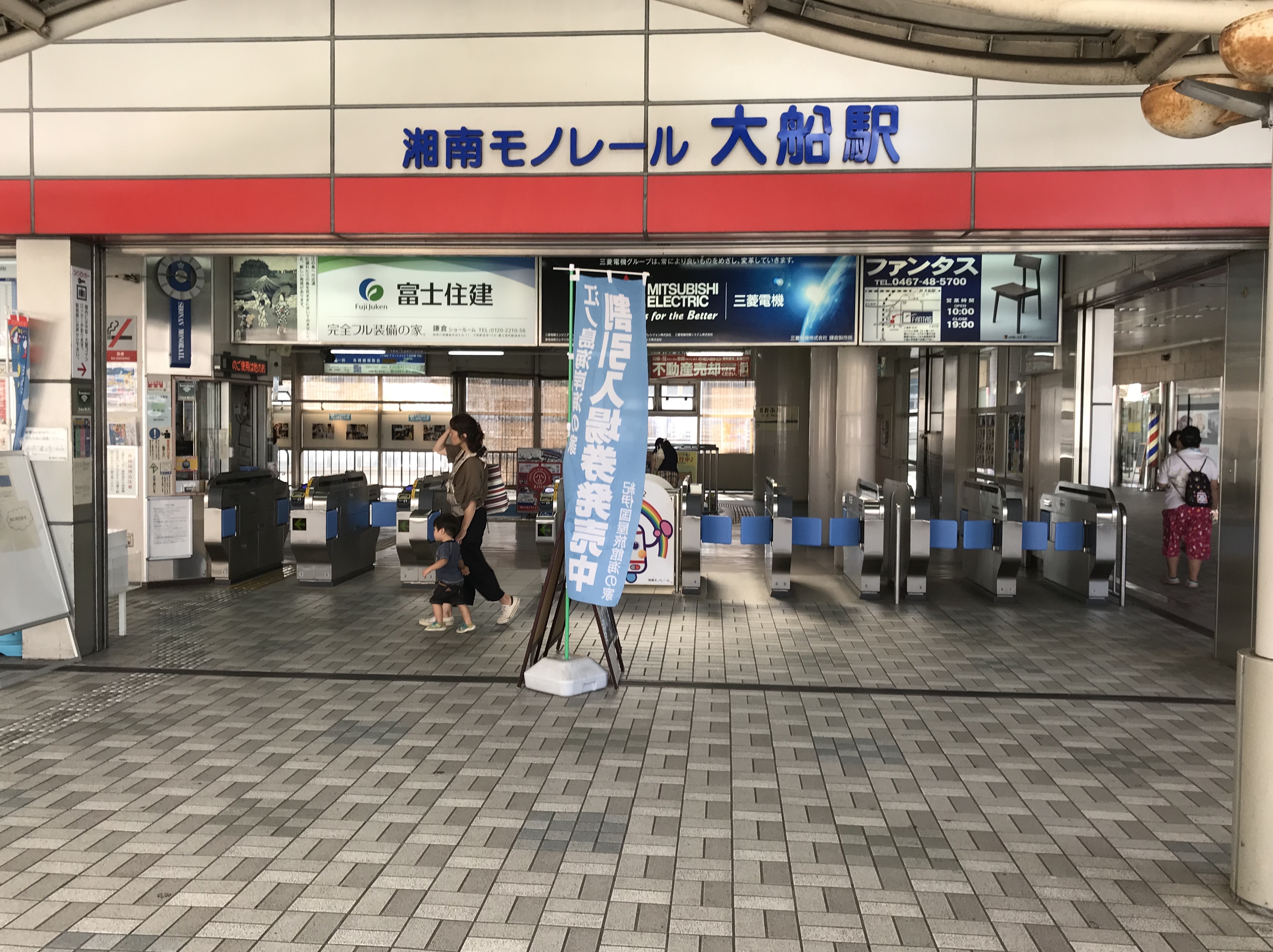 현재의 역사는 가마쿠라시가 주도한 오후나역 동쪽 출구 재개발 사업의 일환으로 재건축되어, 역전 교통 광장 및 역 빌딩과 통합된 형태로 1992년 9월에 완공되었다. 출구는 동쪽에 있으며, 역 구내에는 자동 발권기, 자동 개찰기, 자동 정산기가 설치되어 있다. 또한, 쇼난 모노레일 노선 중 유일하게 정기권 발매 창구와 기념품 등 굿즈 판매 창구가 운영되고 있다.