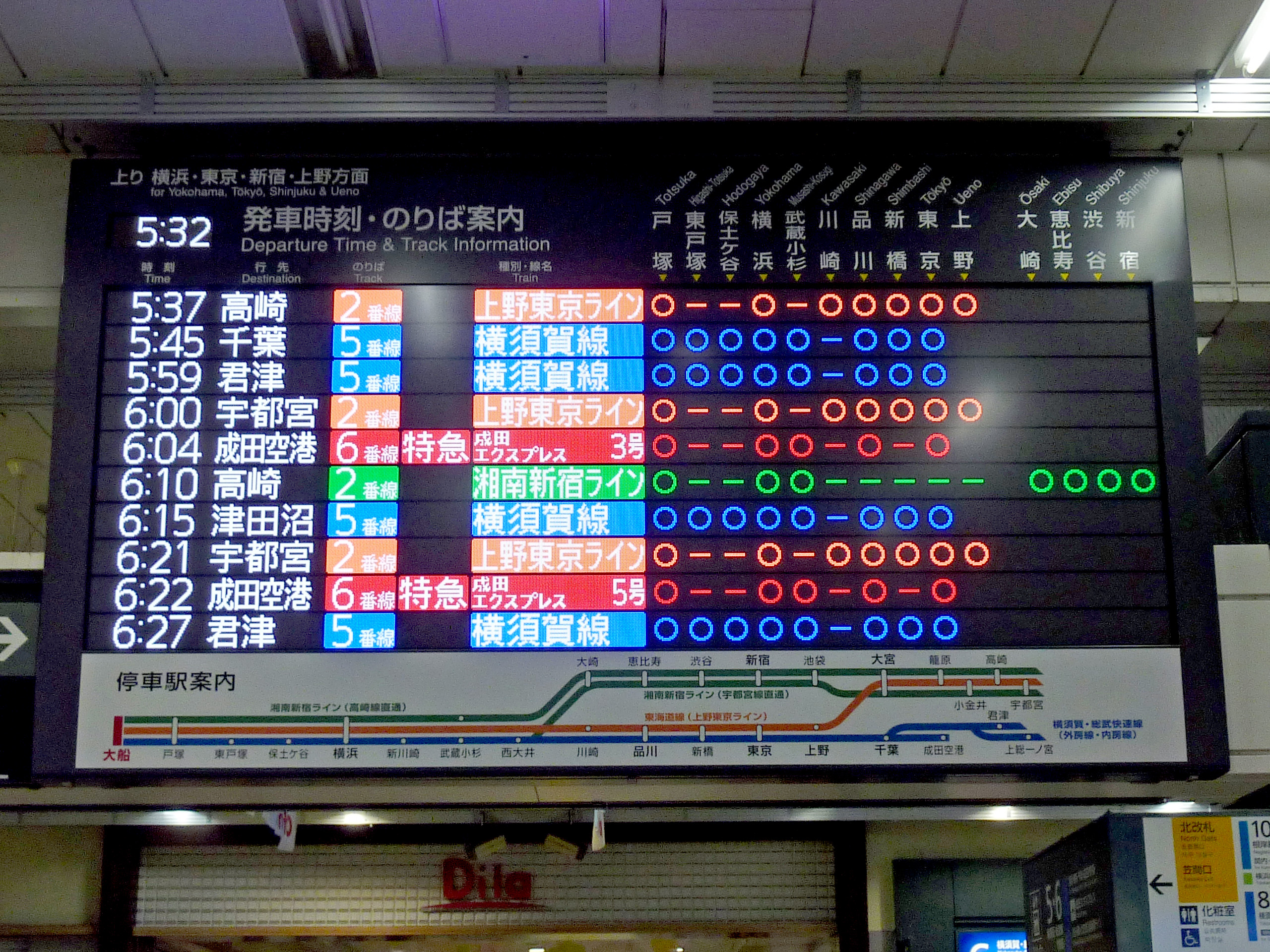JR 동일본 역에 정차하는 우등 열차는, 도쿄와 이즈를 잇는 도카이도선의 특급 "오도리코" 및 도쿄 도심과 쇼난 지구 간의 통근객을 타겟으로 한 특급 "쇼난"이 일부 정차하며, 요코스카선에서는 나리타 국제공항으로의 액세스 열차인 "나리타 익스프레스"의 시종착역이 되고 있다. 보통 열차는, 도카이도선・요코스카선의 보통, 쇼난 신주쿠 라인의 특별 쾌속・쾌속・보통, 네기시선의 쾌속・각역 정차의 모든 열차가 정차한다[12]。