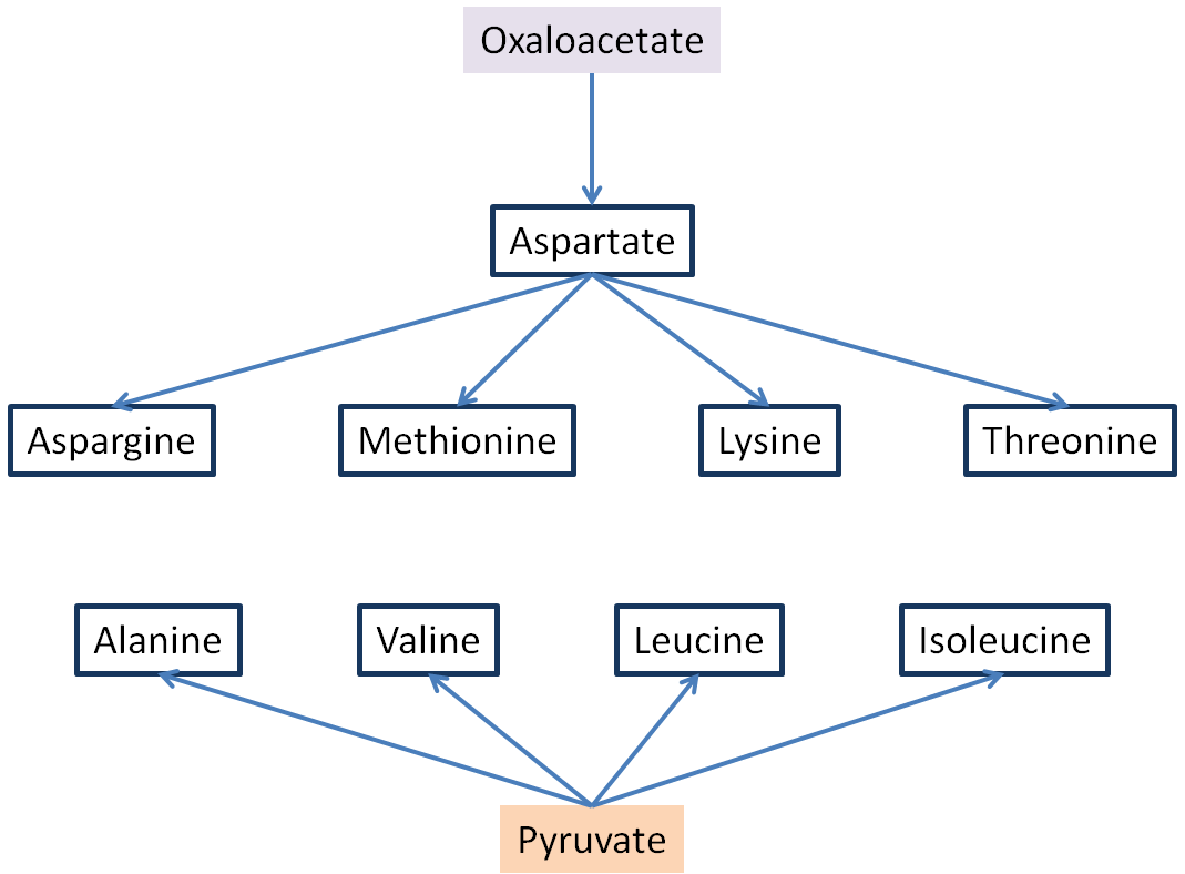 6종류의 필수 아미노산과 3종류의 비필수 아미노산은 옥살로아세트산과 피루브산으로부터 합성된다.[19][6] 아스파르트산은 옥살로아세트산에 글루탐산아미노기가 전이되어 형성되고, 알라닌은 피루브산에 글루탐산의 아미노기가 전이되어 형성된다. 옥살로아세트산으로부터 아스파르트산이 생성되며, 이 아스파르트산으로부터 아스파라진, 메싸이오닌, 리신, 트레오닌이 생성된다. 아스파라진은 아스파르트산의 아미드화 반응에 의해 합성되며, 이때 글루타민이 암모늄 이온(NH4+)을 제공한다.