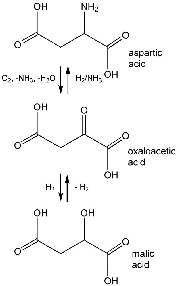 마지막으로, 아스파르트산으로부터 트랜스아미네이션 또는 탈아미노화 과정을 통해 옥살로아세트산이 생성될 수 있다.[2] 예를 들어, 아스파르트산 아미노기 전이효소는 아스파르트산아미노기를 α-케토글루타르산으로 전이시켜 글루탐산과 옥살로아세트산을 만든다.[13]
