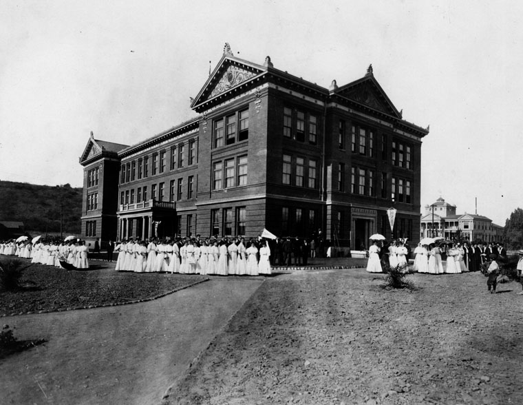1896년, 보일 하이츠의 건물은 화재로 소실되었다. 대학교는 임시로 힐 스트리트에 있는 옛 로욜라 메리마운트 대학교의 세인트 빈센트 칼리지 캠퍼스로 이전했다가, 1898년 하이랜드 파크에 새로운 부지를 마련했다.[1] 결국, 대학교는 아카데미 빌딩, 스팀슨 도서관, 예술 및 문학관(현재 아파트로 개조됨) 등 3개의 주요 건물을 세웠다.[9] 하이랜드 파크 부지는 산타페 철도 선로에 의해 양분되어 있었으며,[1] 1909년 윌리엄 하워드 태프트 대통령과 1911년 시어도어 루스벨트 대통령이 방문하기도 했다.[1]