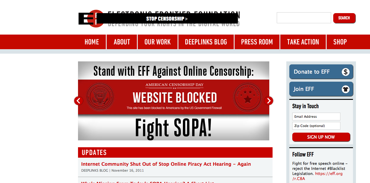 구글, 트위터, 페이스북 등의 인터넷 서비스 기업들은 SOPA가 인터넷 사용을 법적으로 강력하게 규제한다는 점을 비판했다. 구글의 에릭 슈미트 회장은 2011년 12월에 SOPA를 실현 불가능한 법안이라고 비판했다.[260] 영어 위키백과는 SOPA에 반대하는 의미로 2012년 1월 18일부터 24시간 동안 서비스를 중지했고,[261] 같은 날 약 7000개의 다른 웹사이트도 비슷한 방식으로 반대 운동을 펼쳤다.[262]